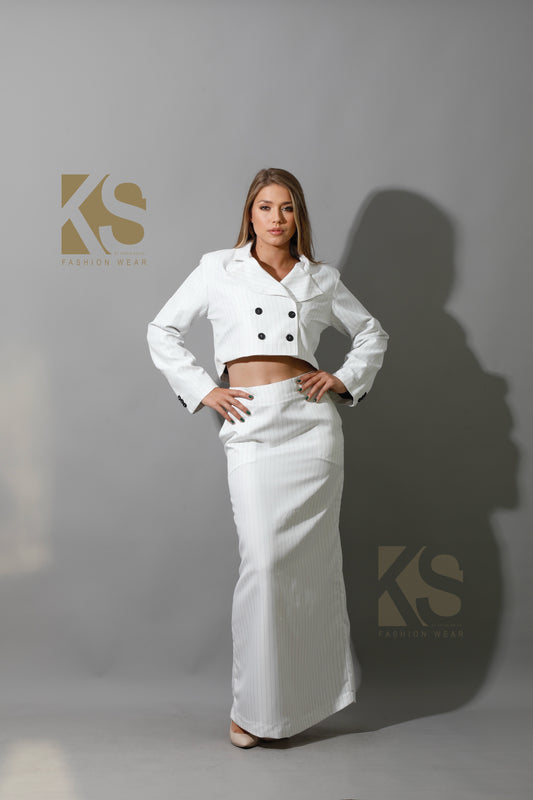 Striped Cropped Blazer, Bra Top & Maxi Skirt Co-Ord - White