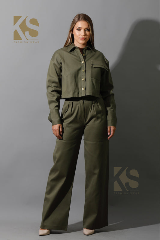 Co-Ord Detached Sleeves Jacket & Tied BootCut pants - Olive