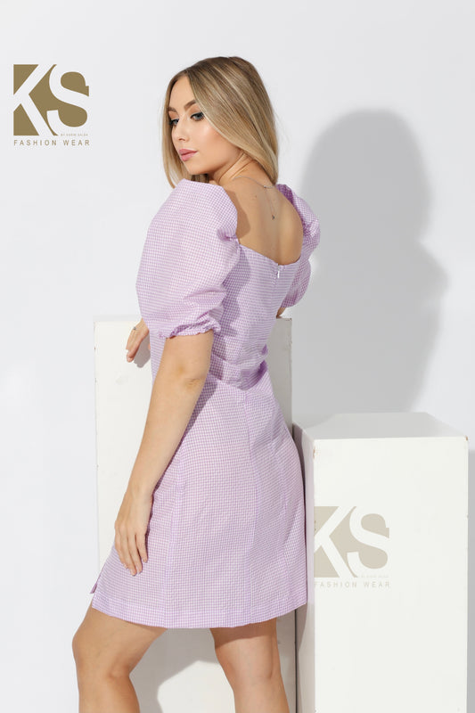 Short Dress with Puff sleeves - Checks Purple