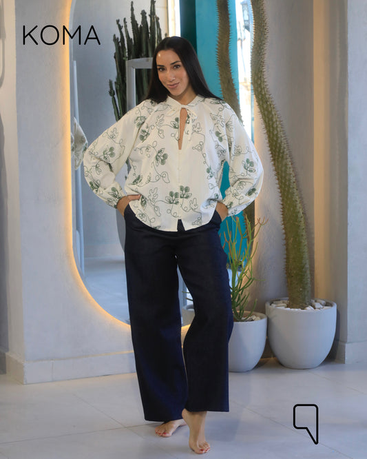 Della Pajama Shirt & Flare Trousers Set - Navy