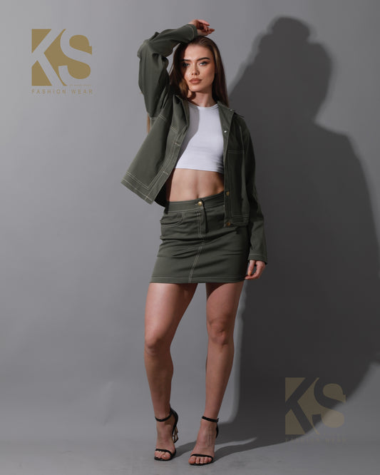 Co-Ord Gabardine Sleeves Jacket & Short Skirt - Olive