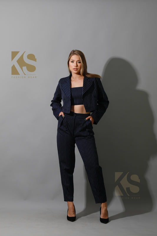 Striped Paper-bag Pants Co-Ord - Navy