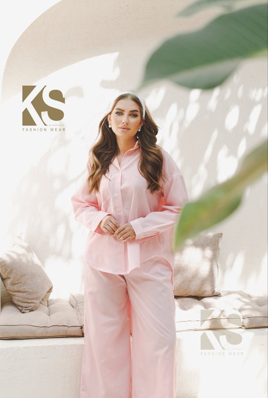 Co-Ord Wide Leg trousers & Lose Shirt Striped - Striped Pink