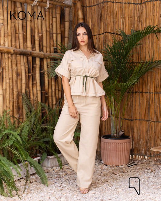 Olivia Safari Shirt & Blend Straight Trousers Set - Beige