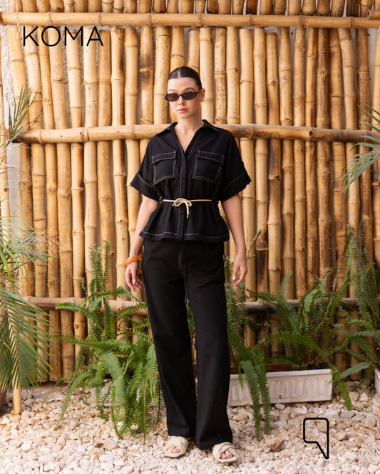 Leilani Stitched Shirt & Straight Trousers Set - Black