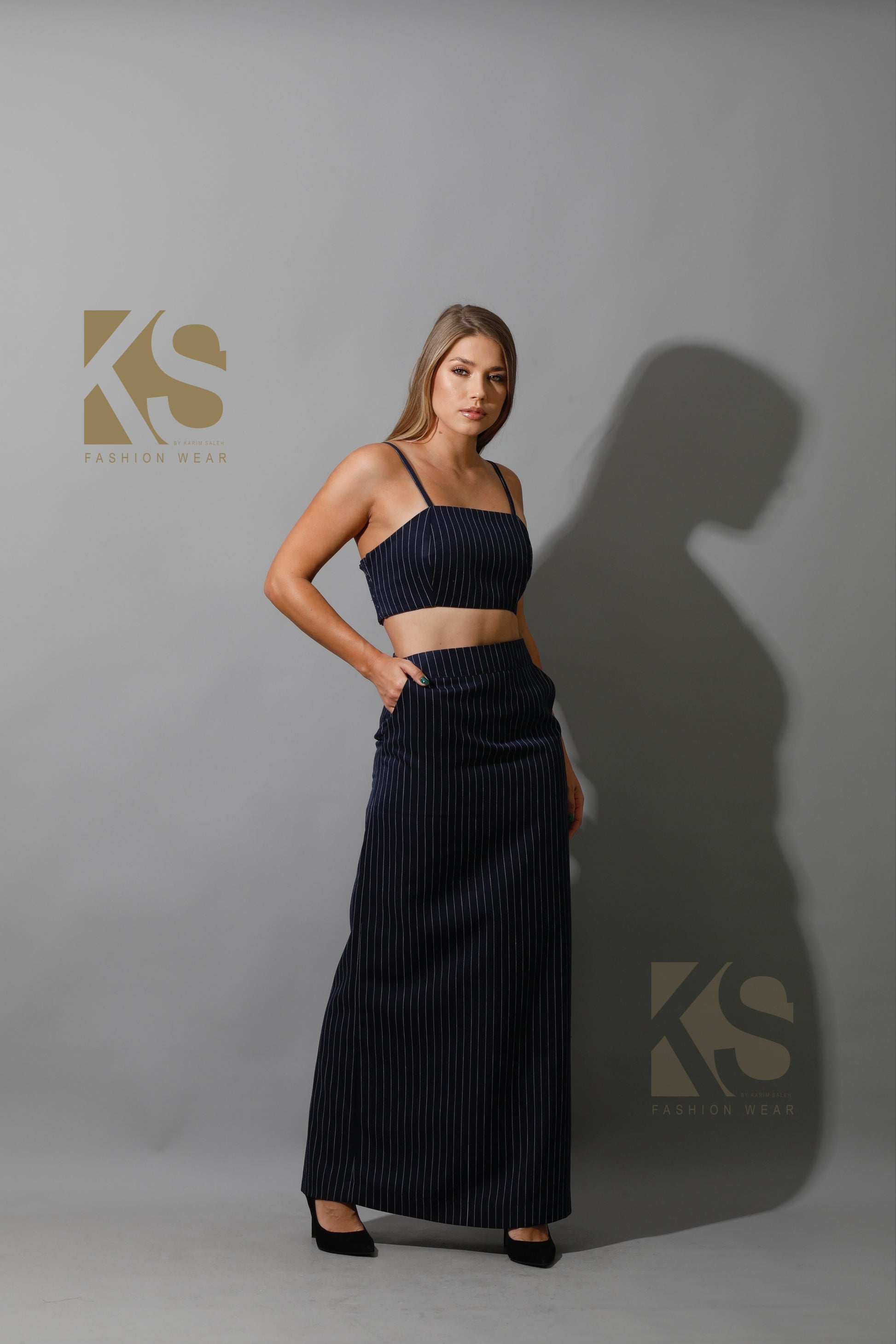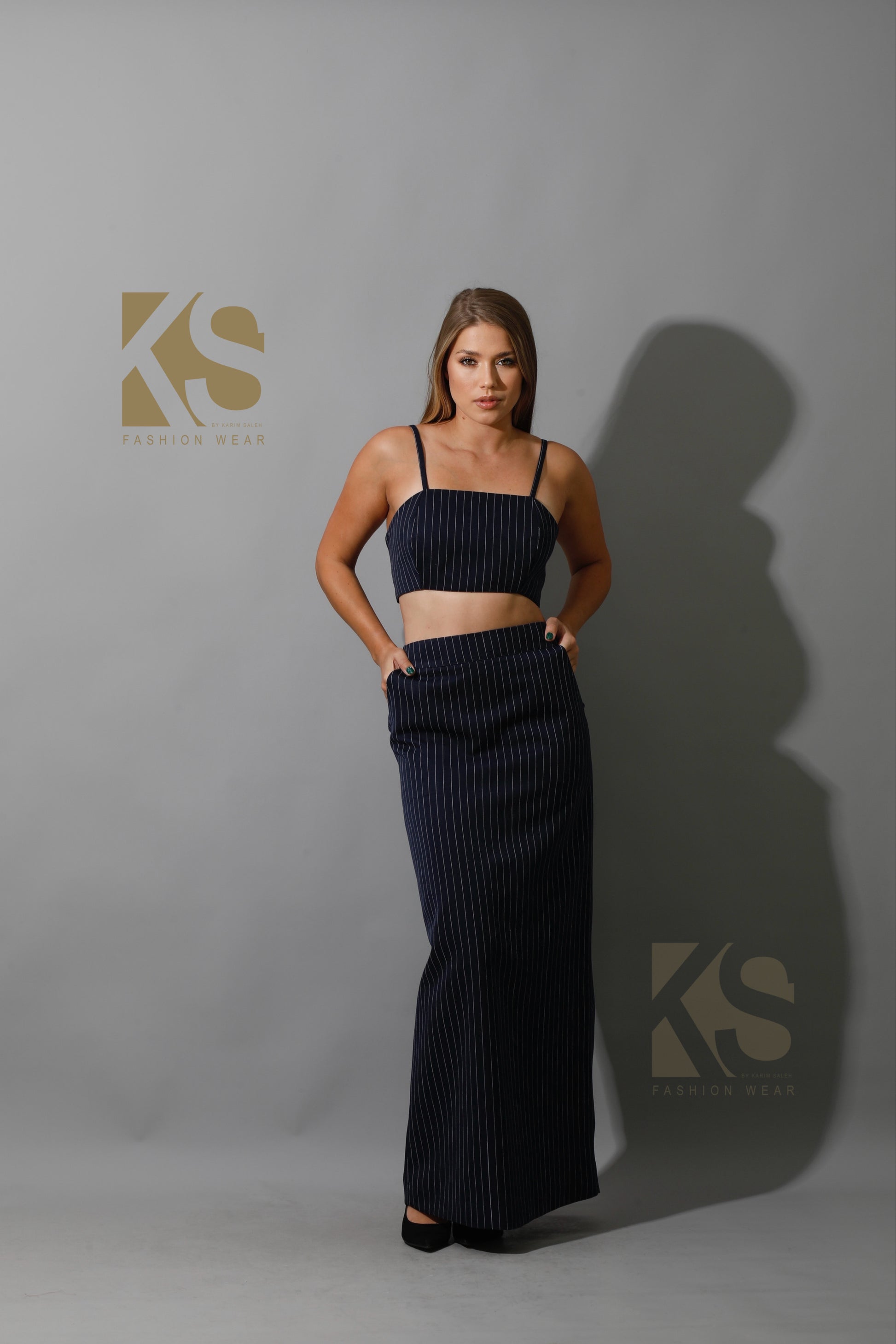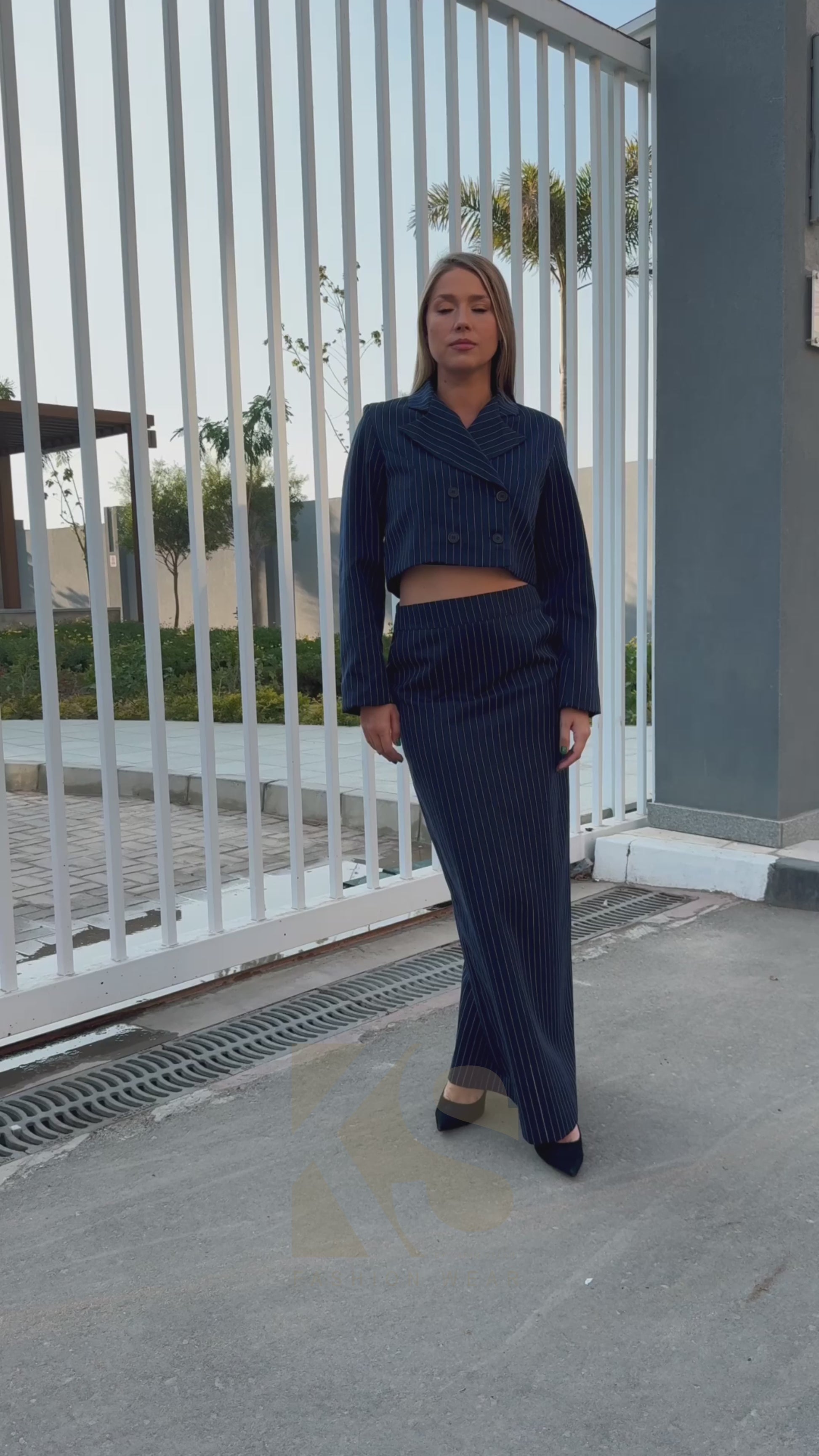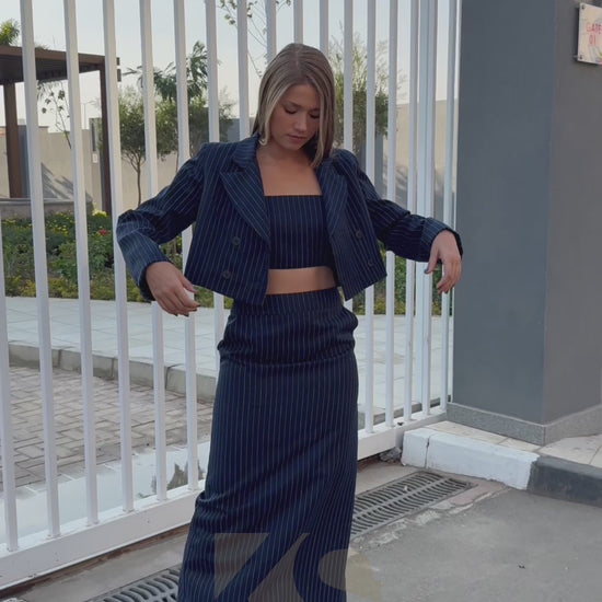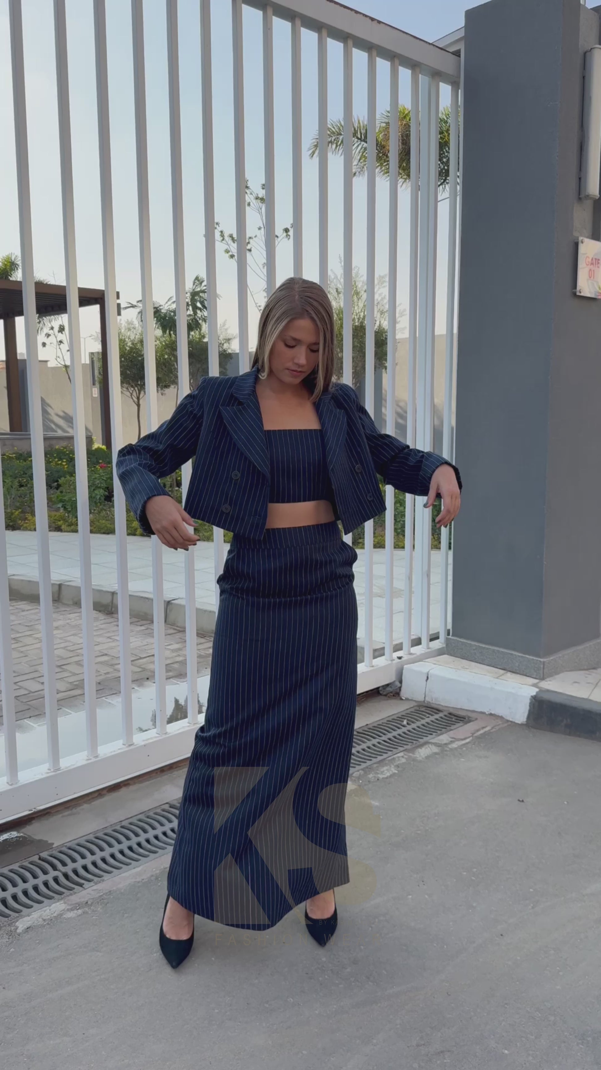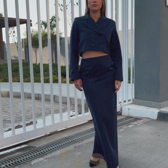 Striped Cropped Blazer, Bra Top & Maxi Skirt Co-Ord - Navy