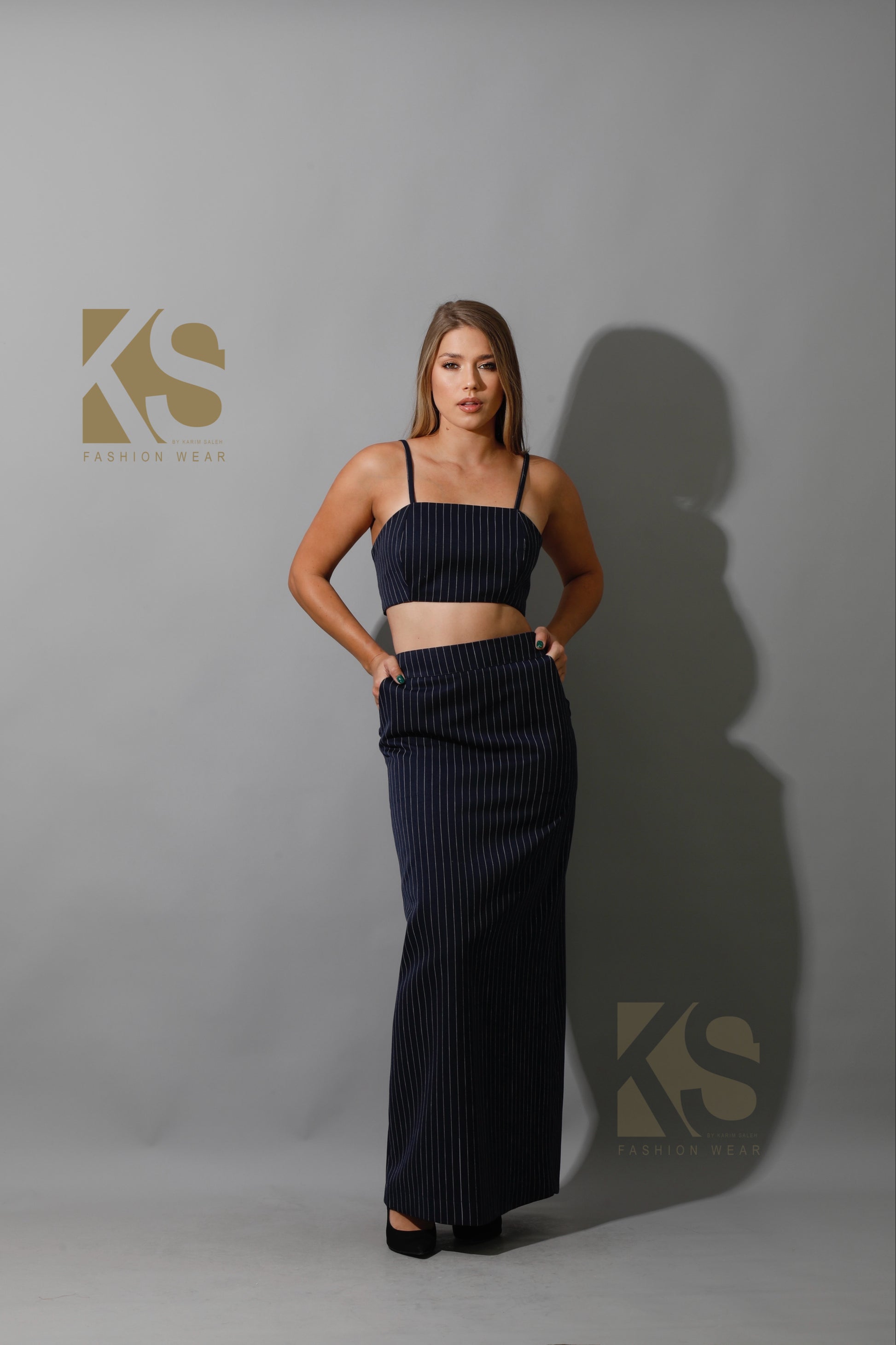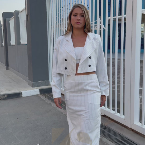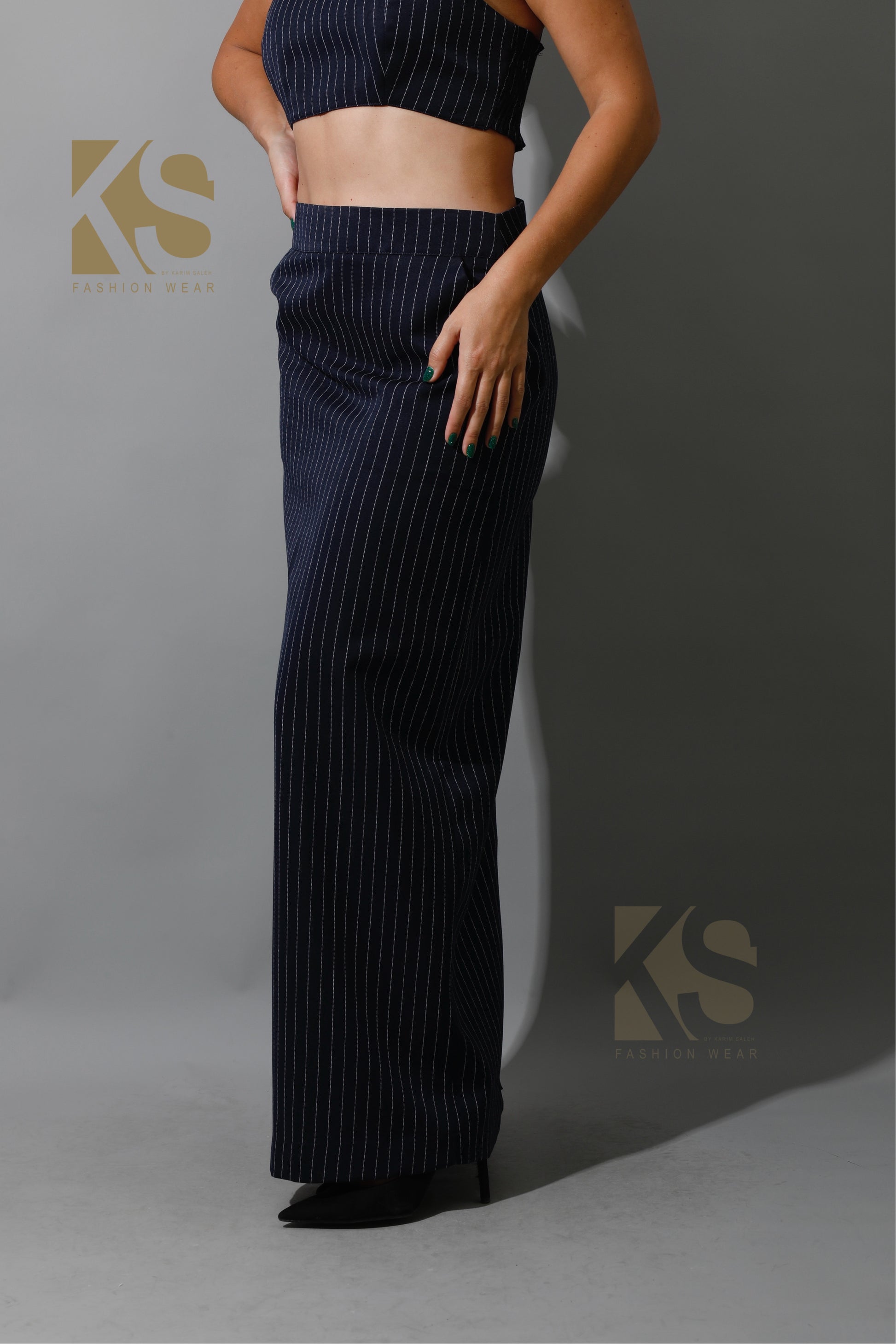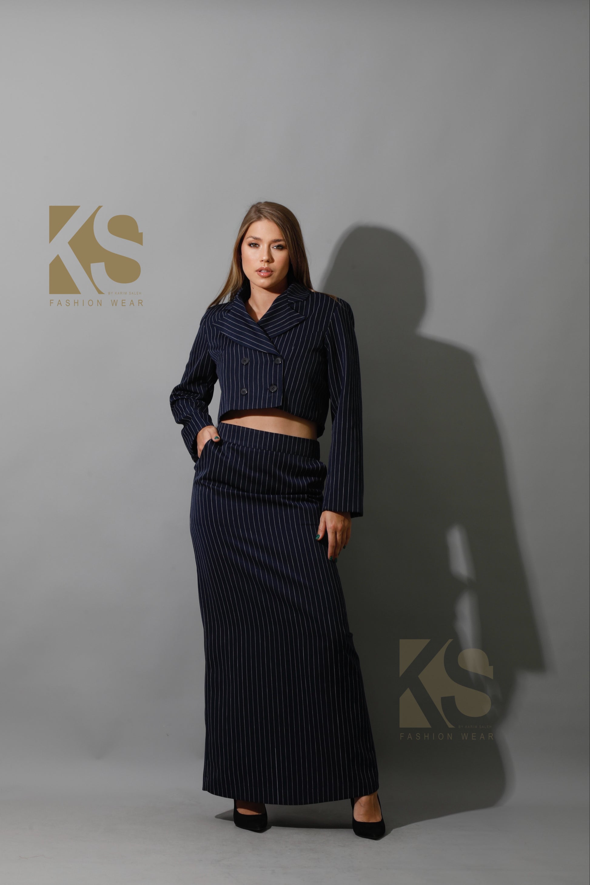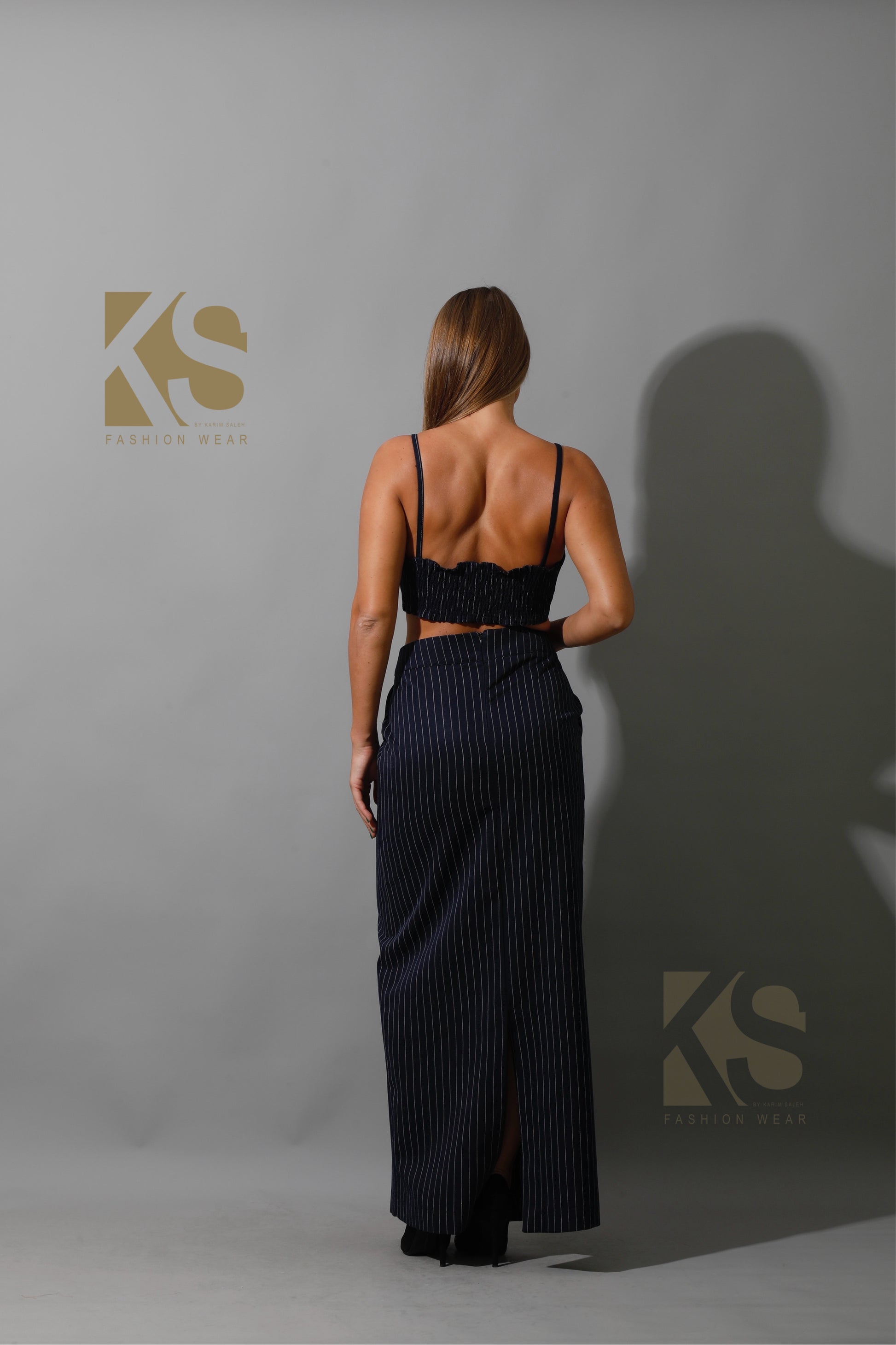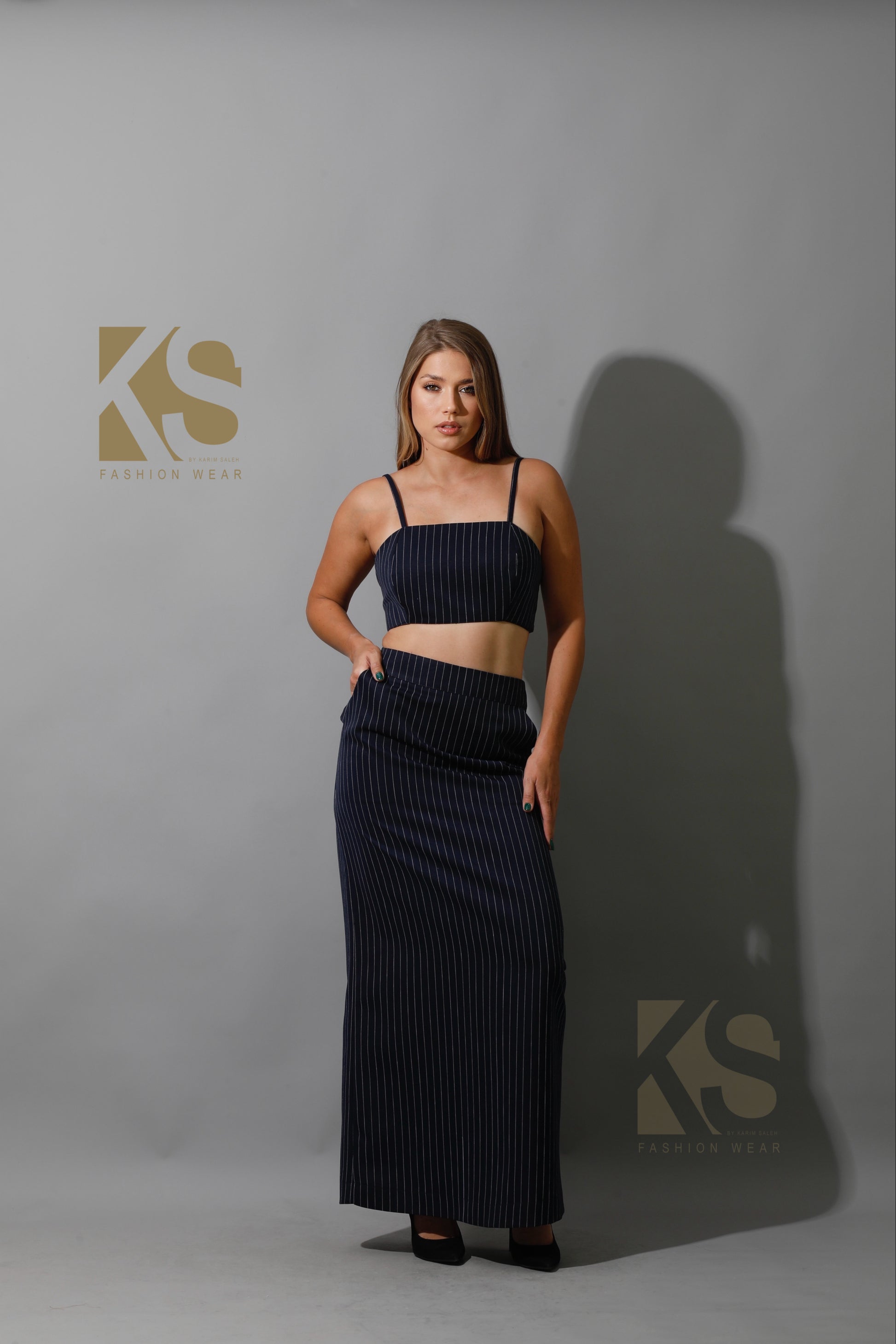 Striped Cropped Blazer, Bra Top & Maxi Skirt Co-Ord - Navy