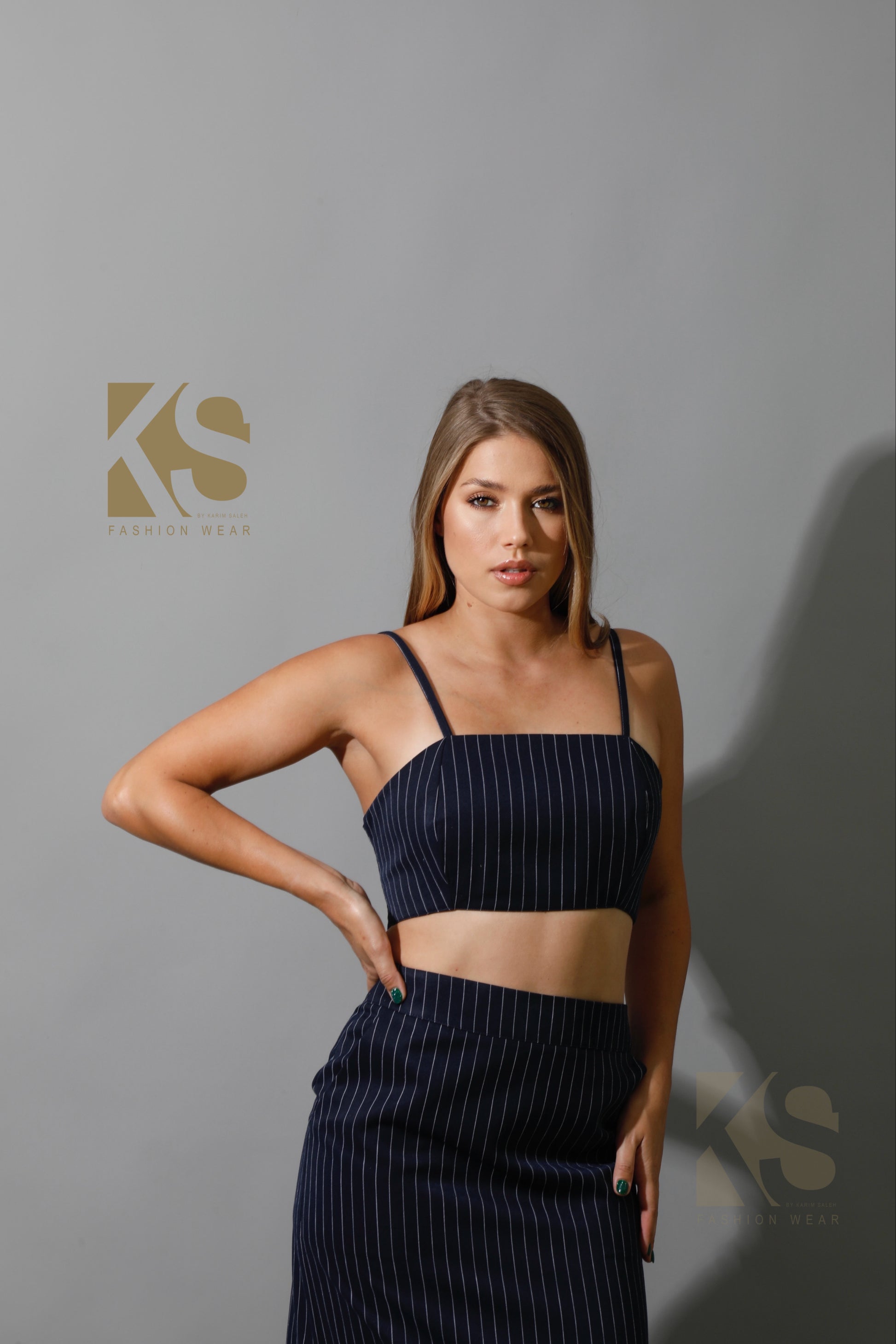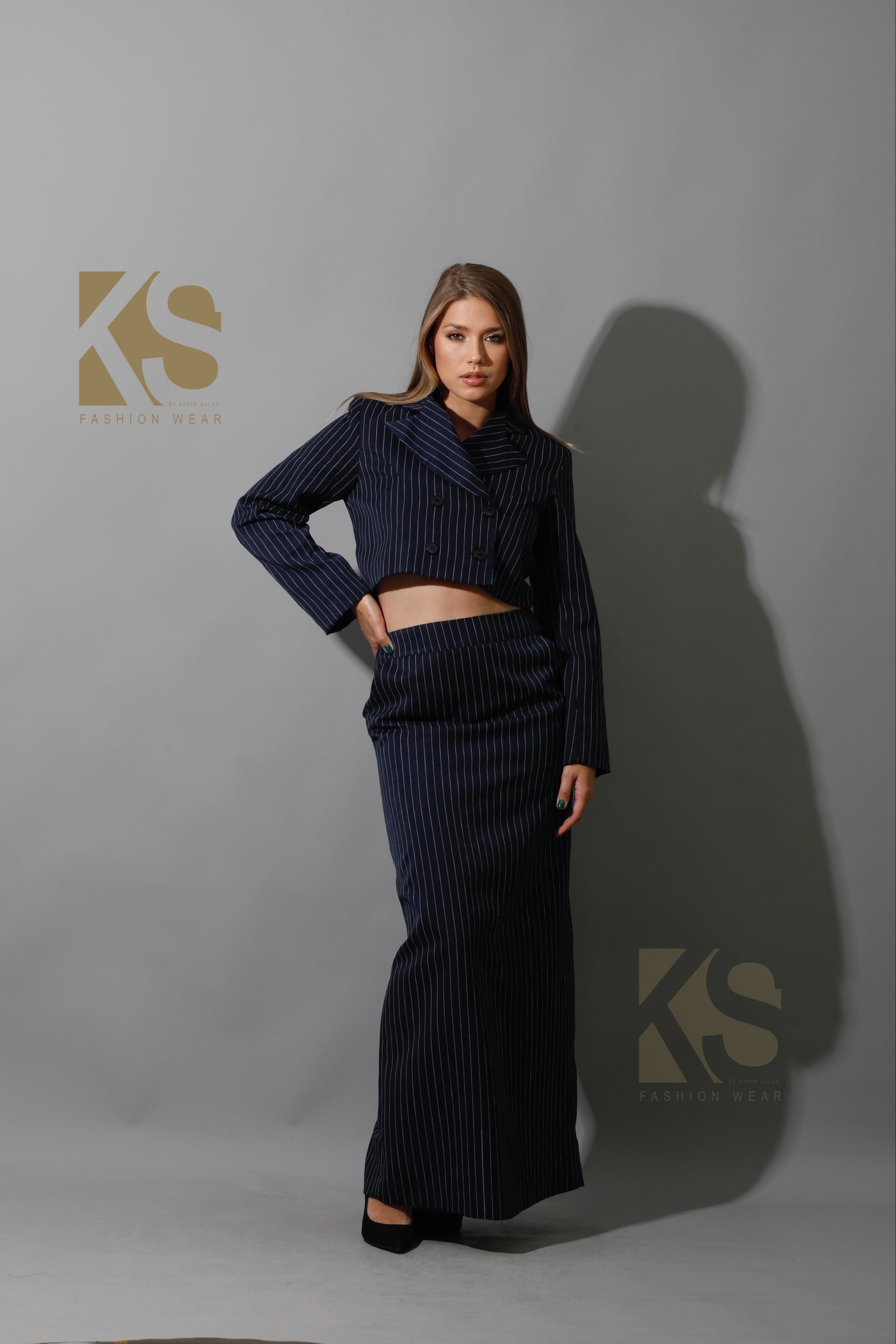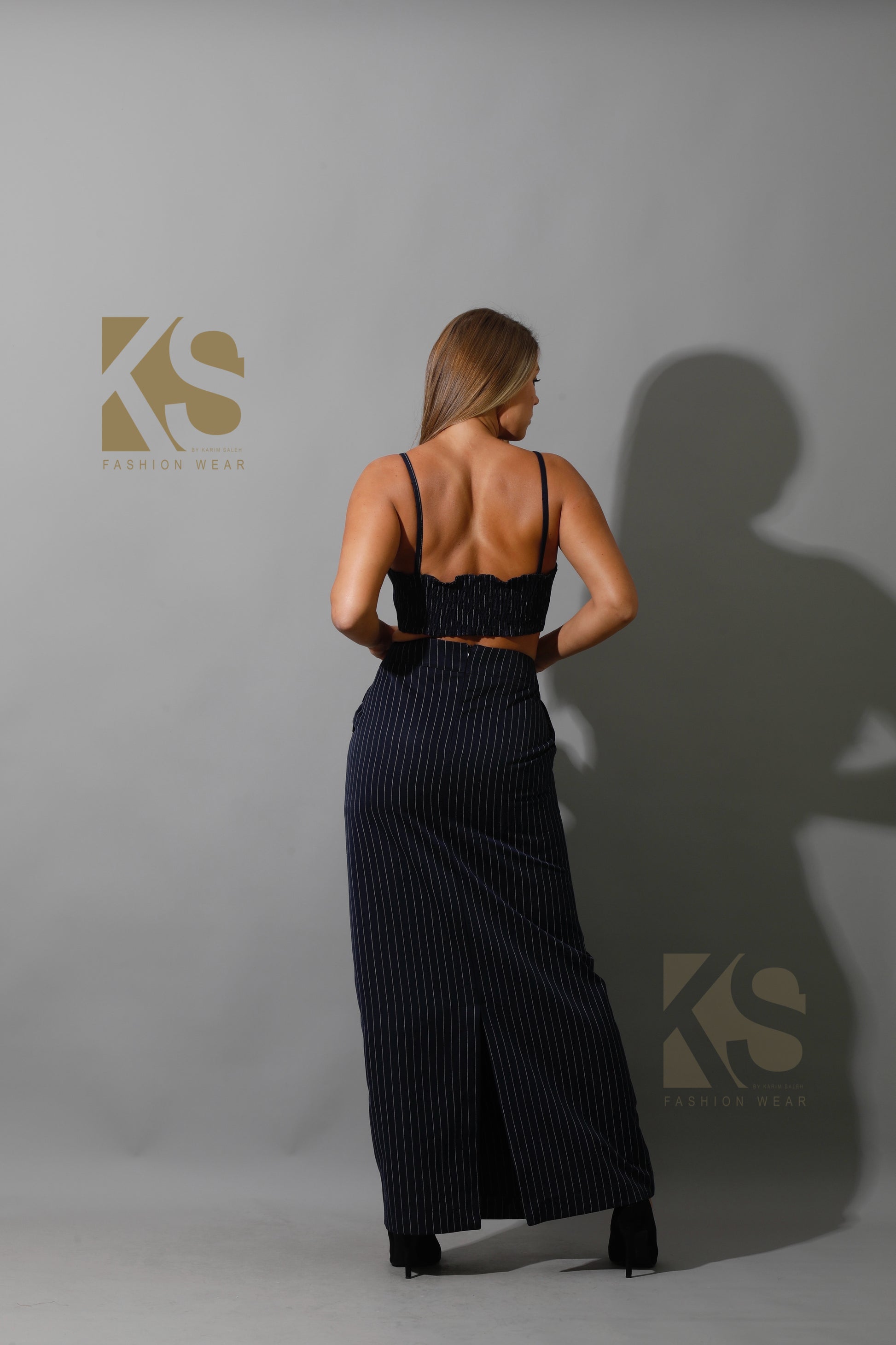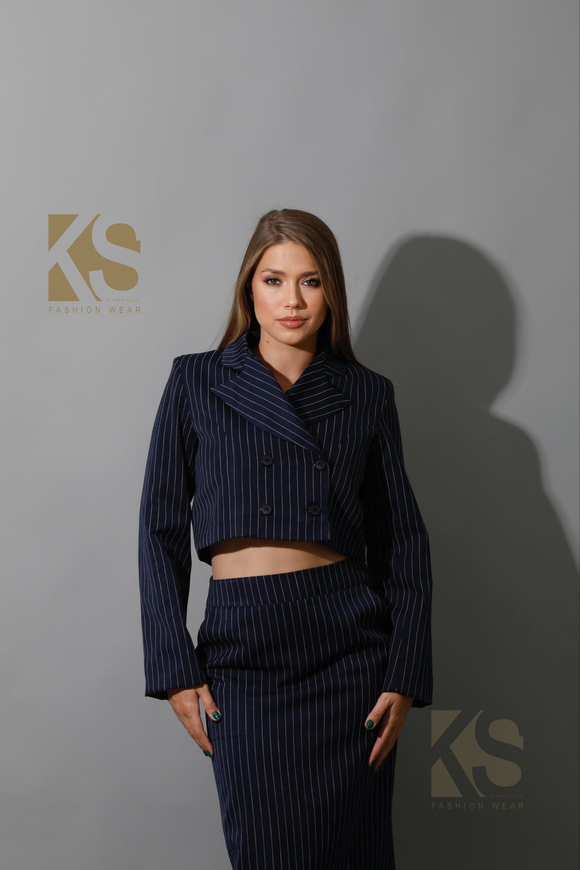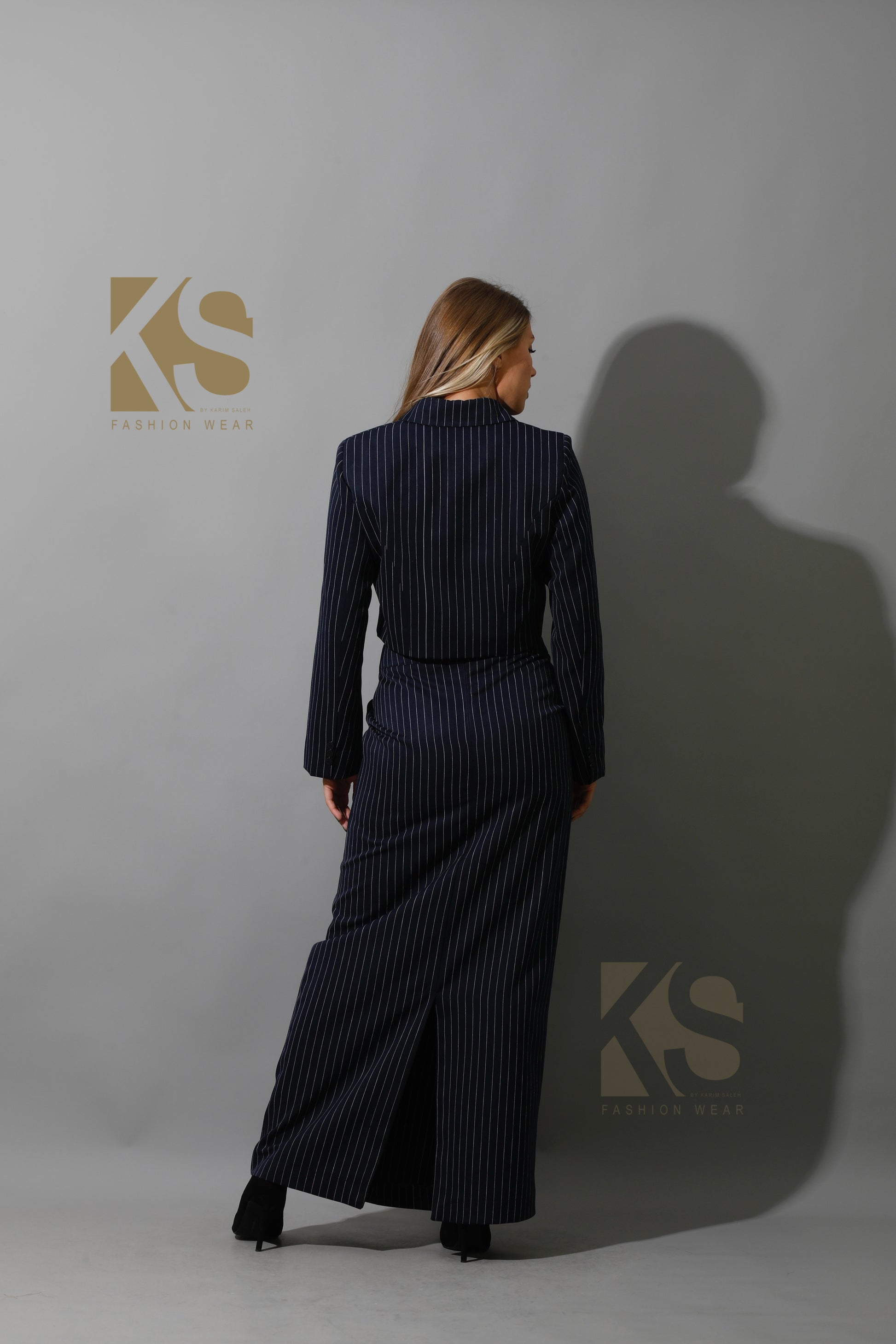 Striped Cropped Blazer, Bra Top & Maxi Skirt Co-Ord - Navy
