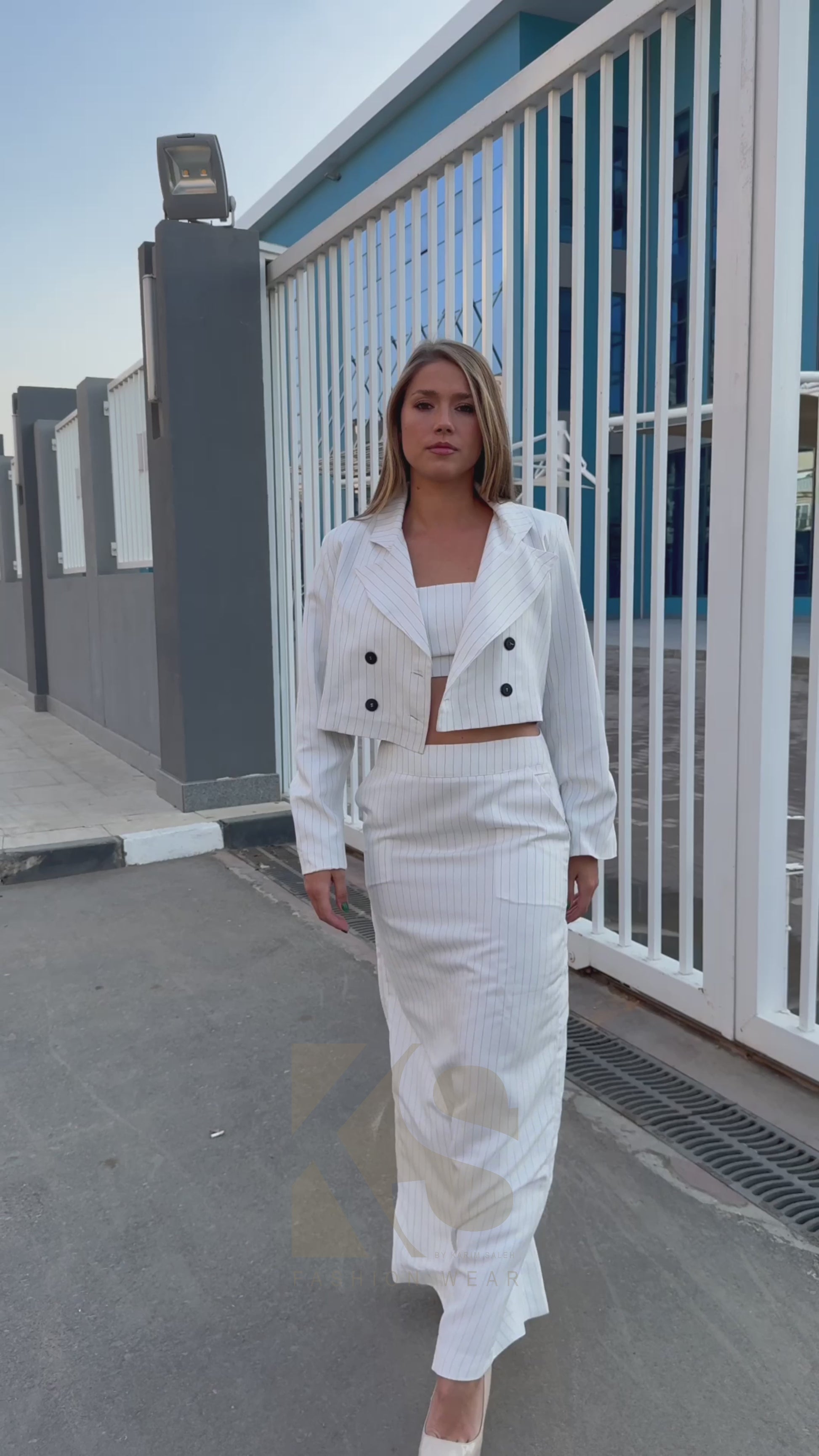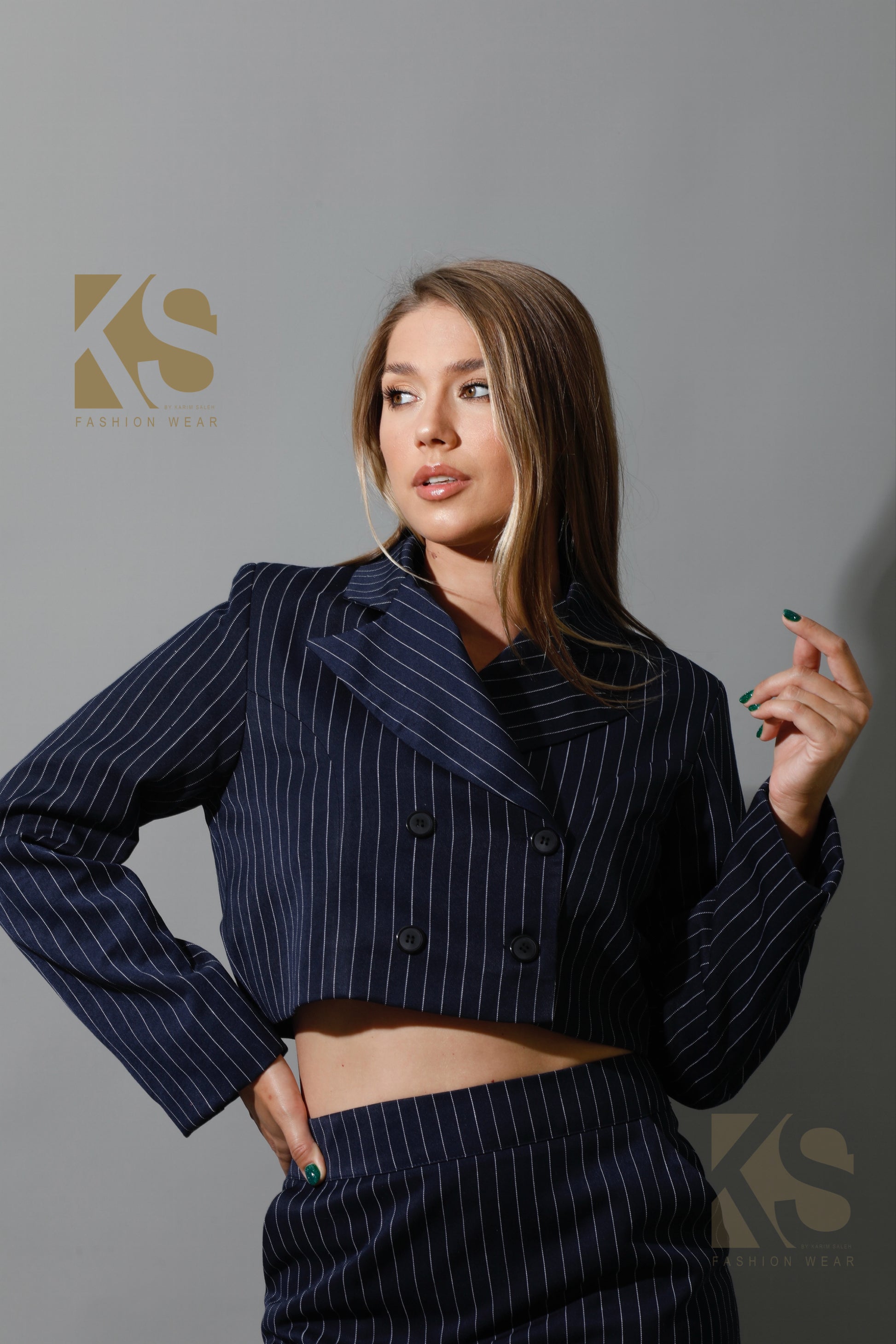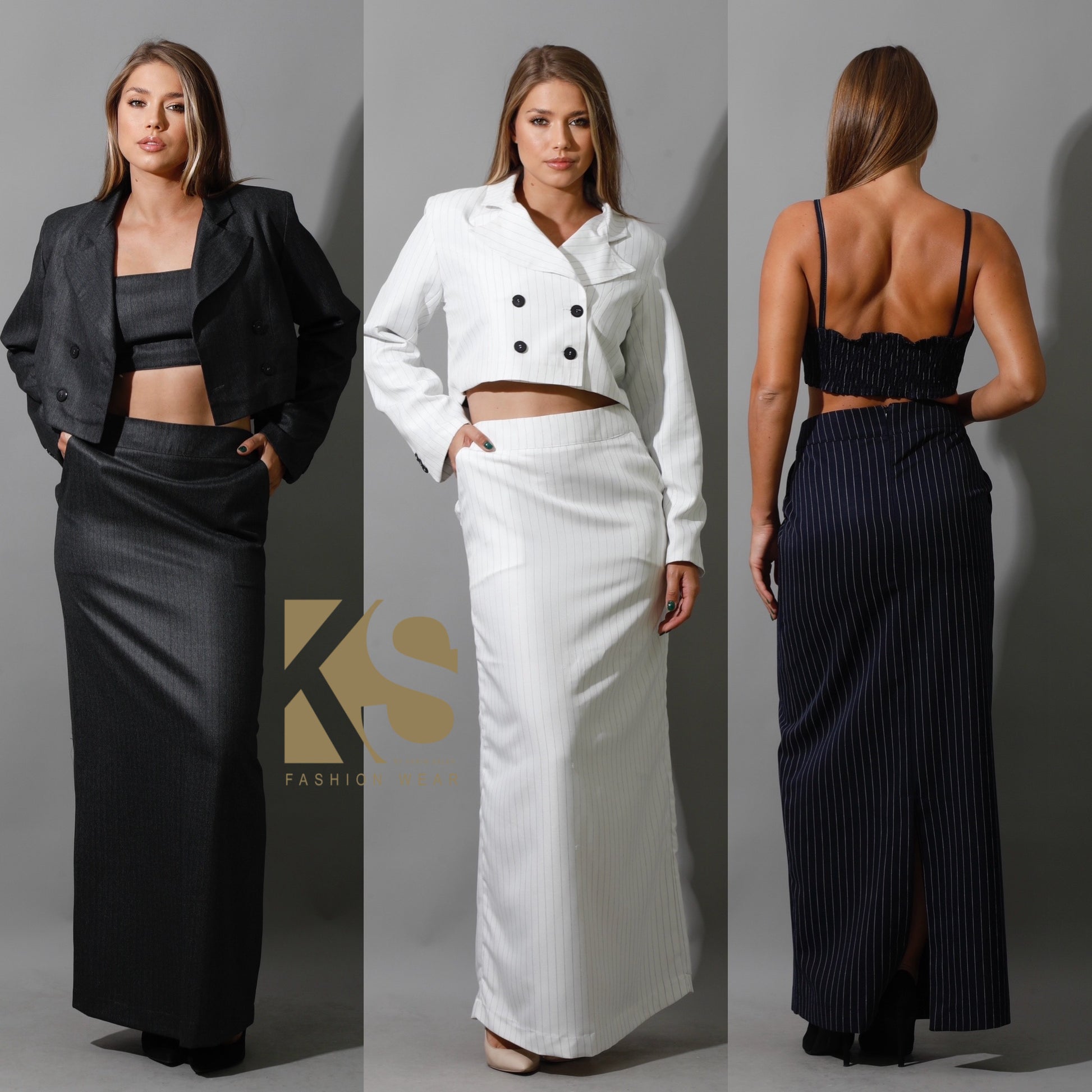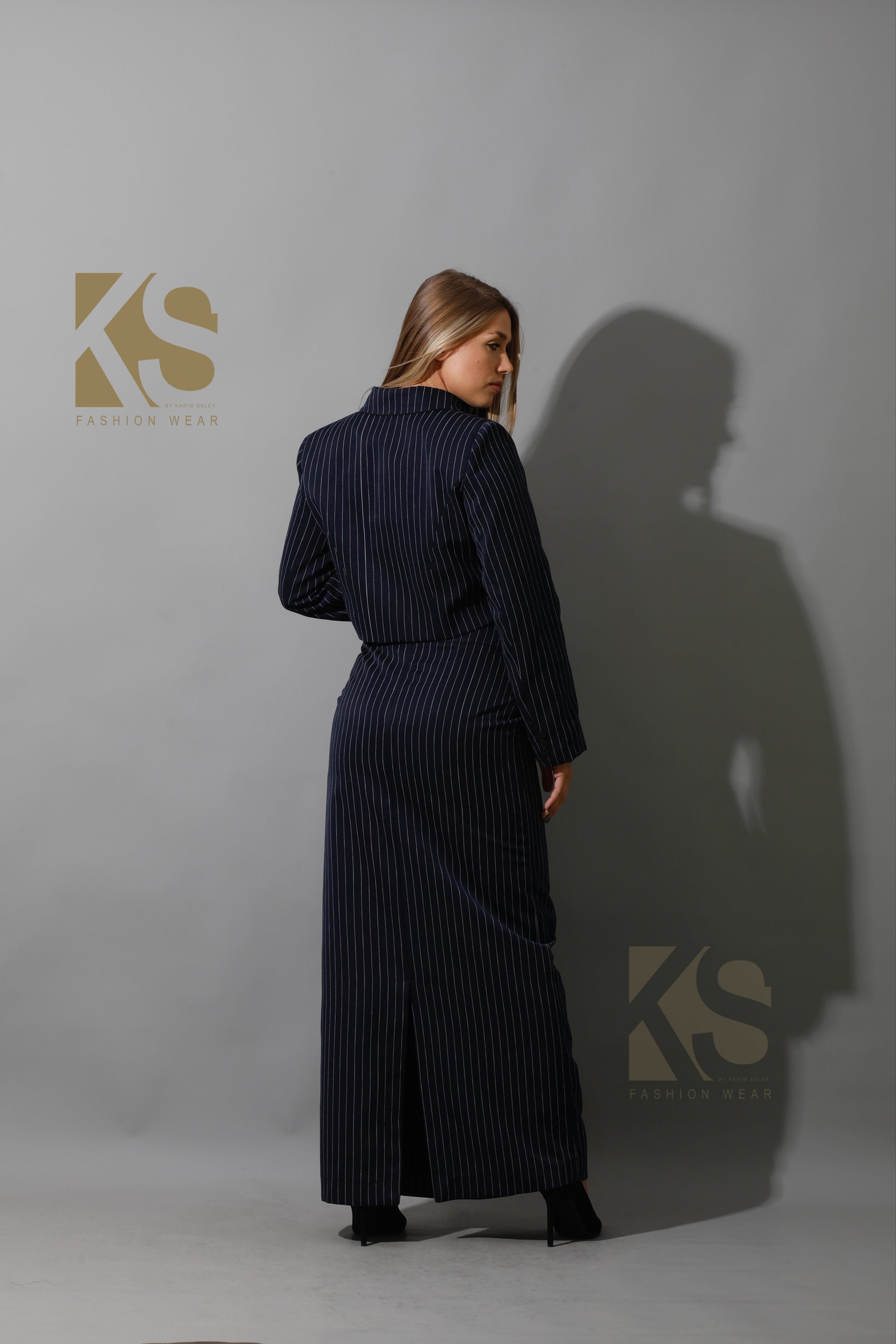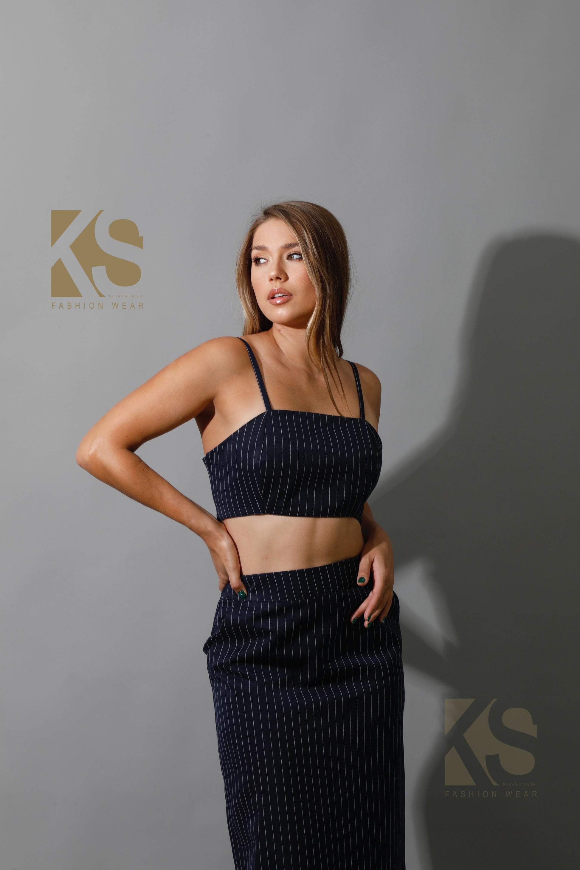 Striped Cropped Blazer, Bra Top & Maxi Skirt Co-Ord - Navy