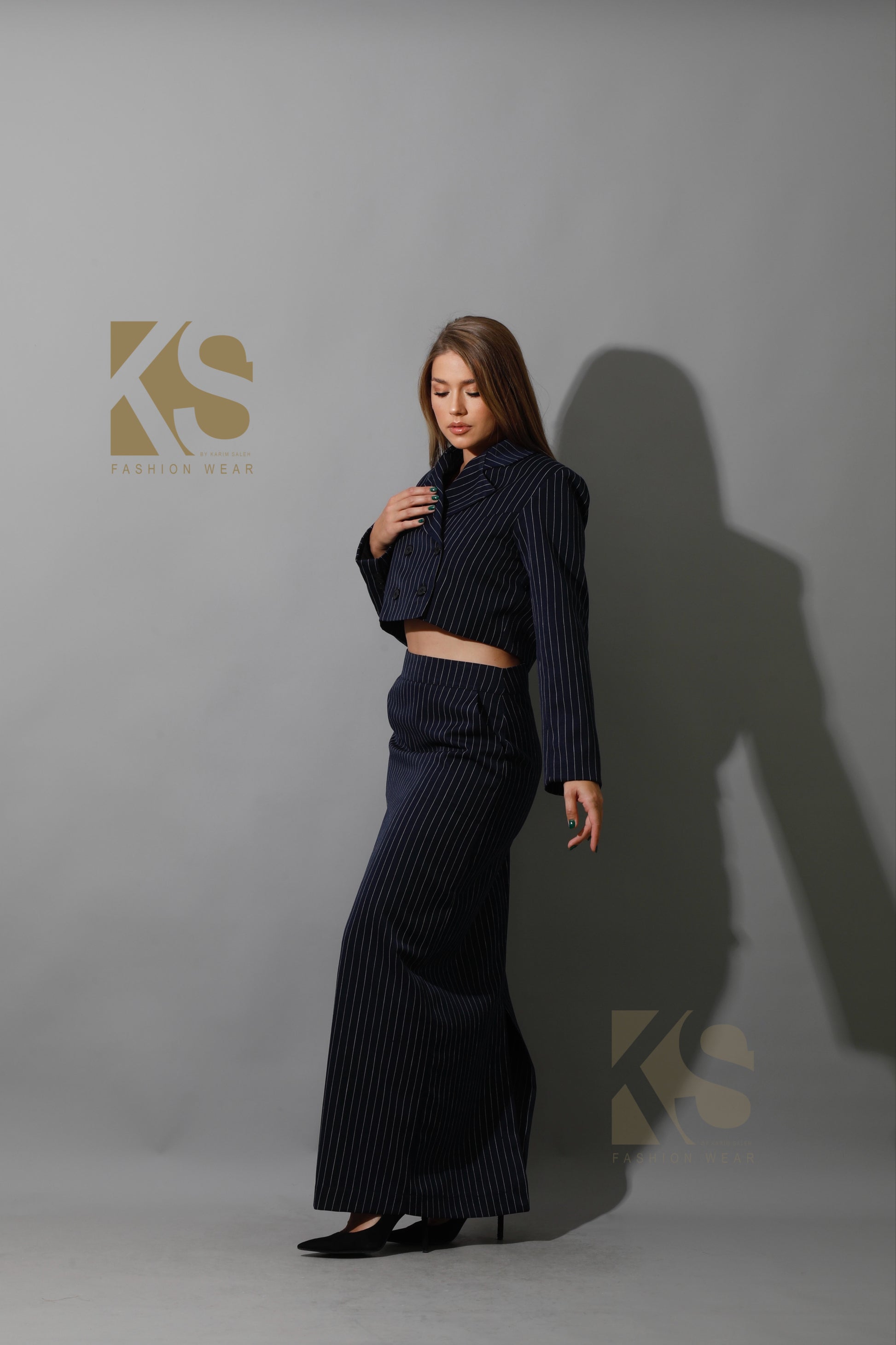 Woolen Striped Cropped Blazer, Bra Top & Maxi Skirt Co-Ord - Navy