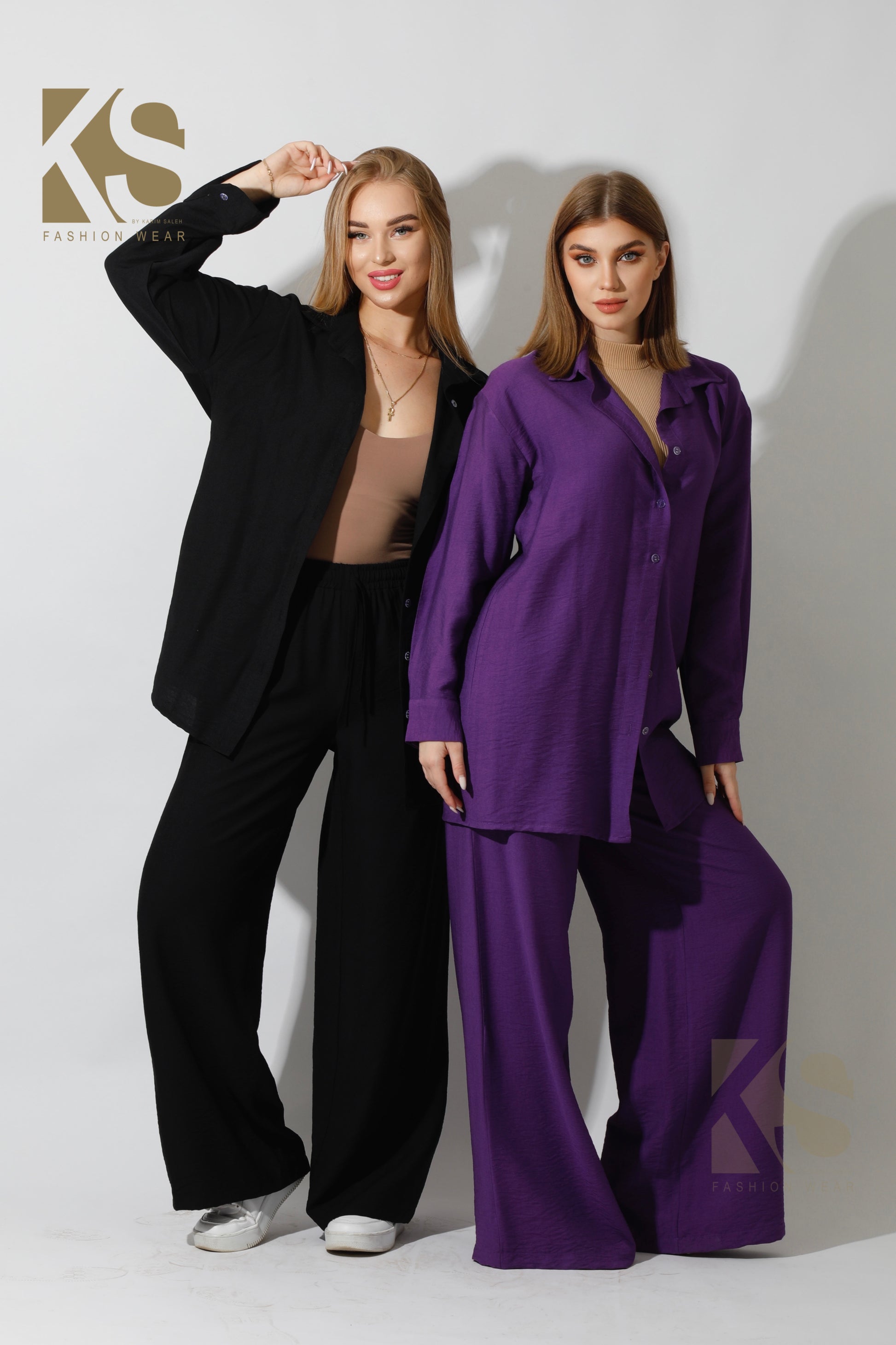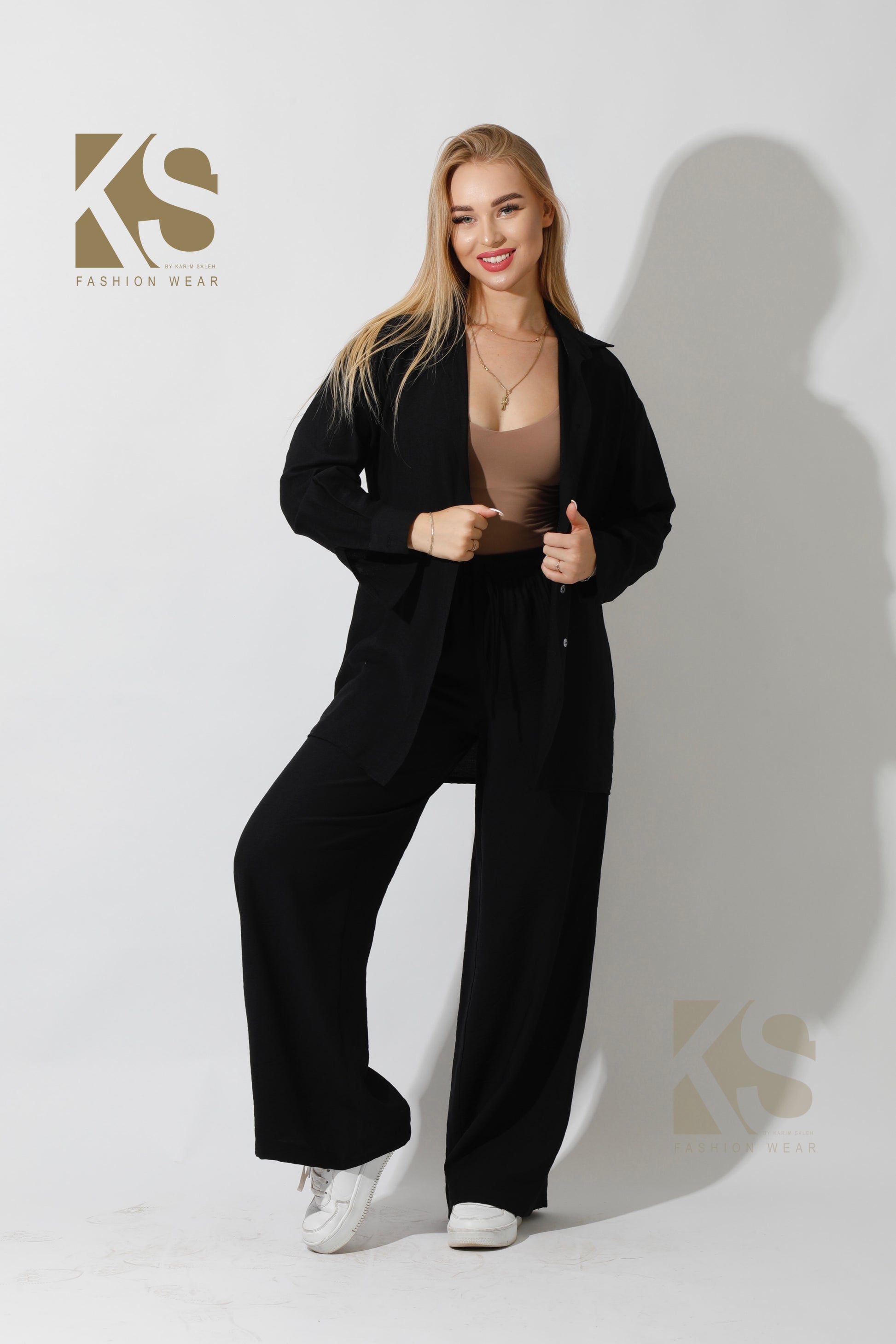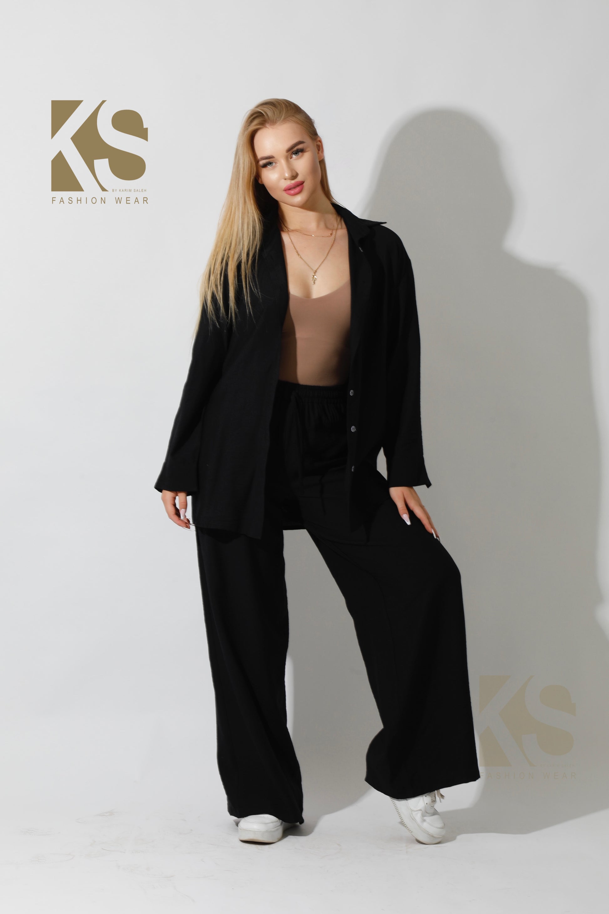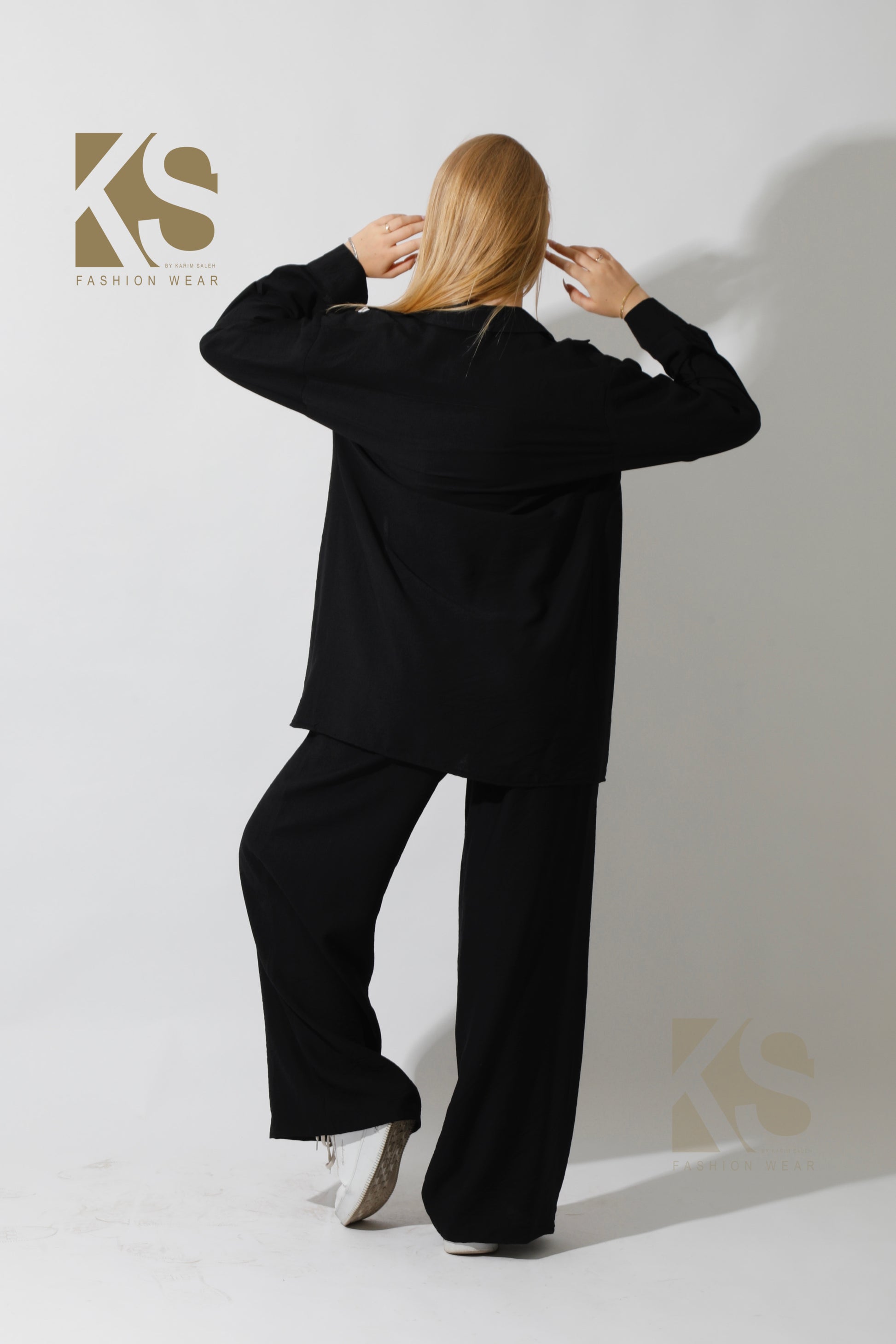 Co-Ord Long Sleeve Shirt & Wide Leg Trousers - Black