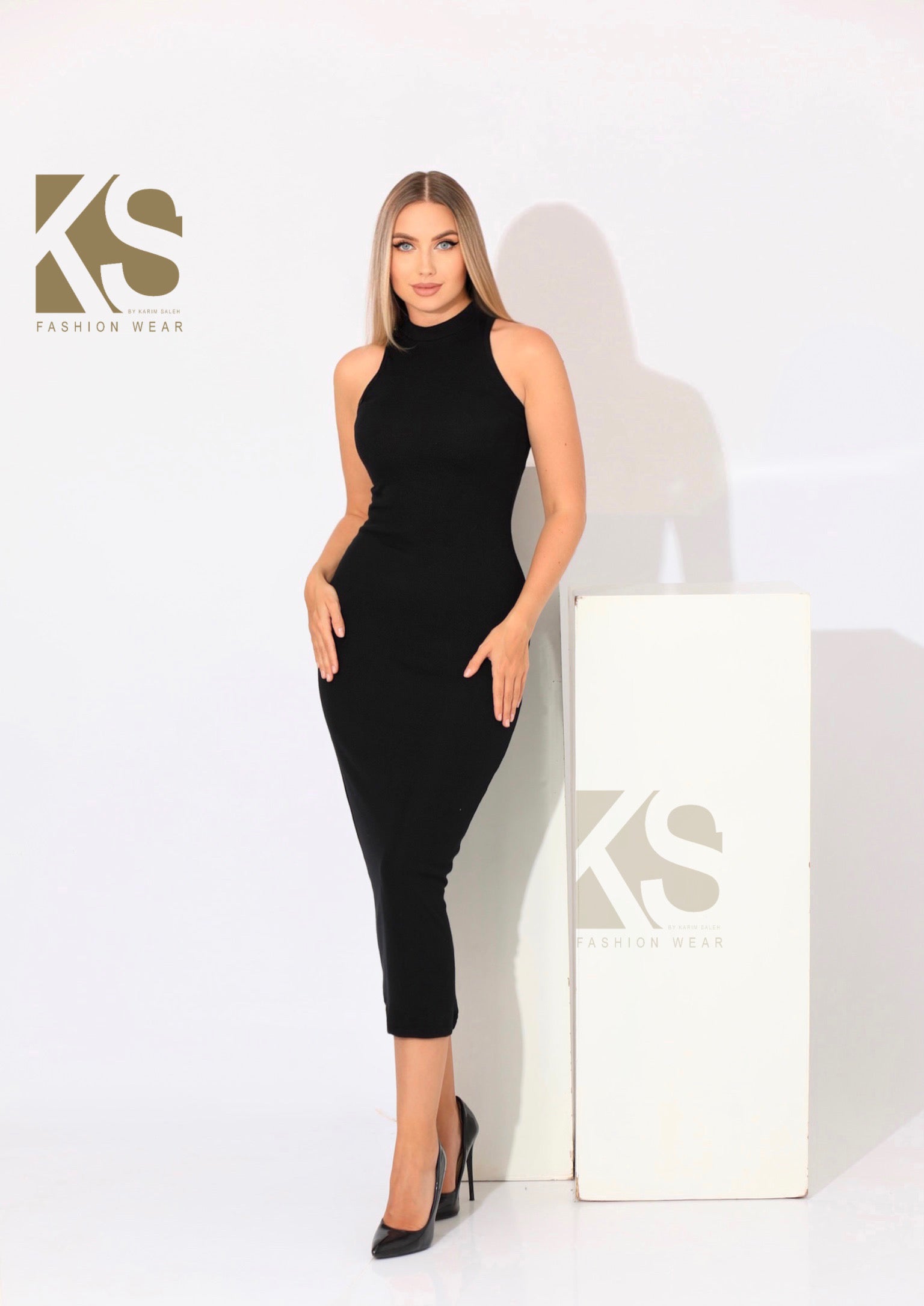 Slinky Derby High Neck Midi sleeveless Dress - Black
