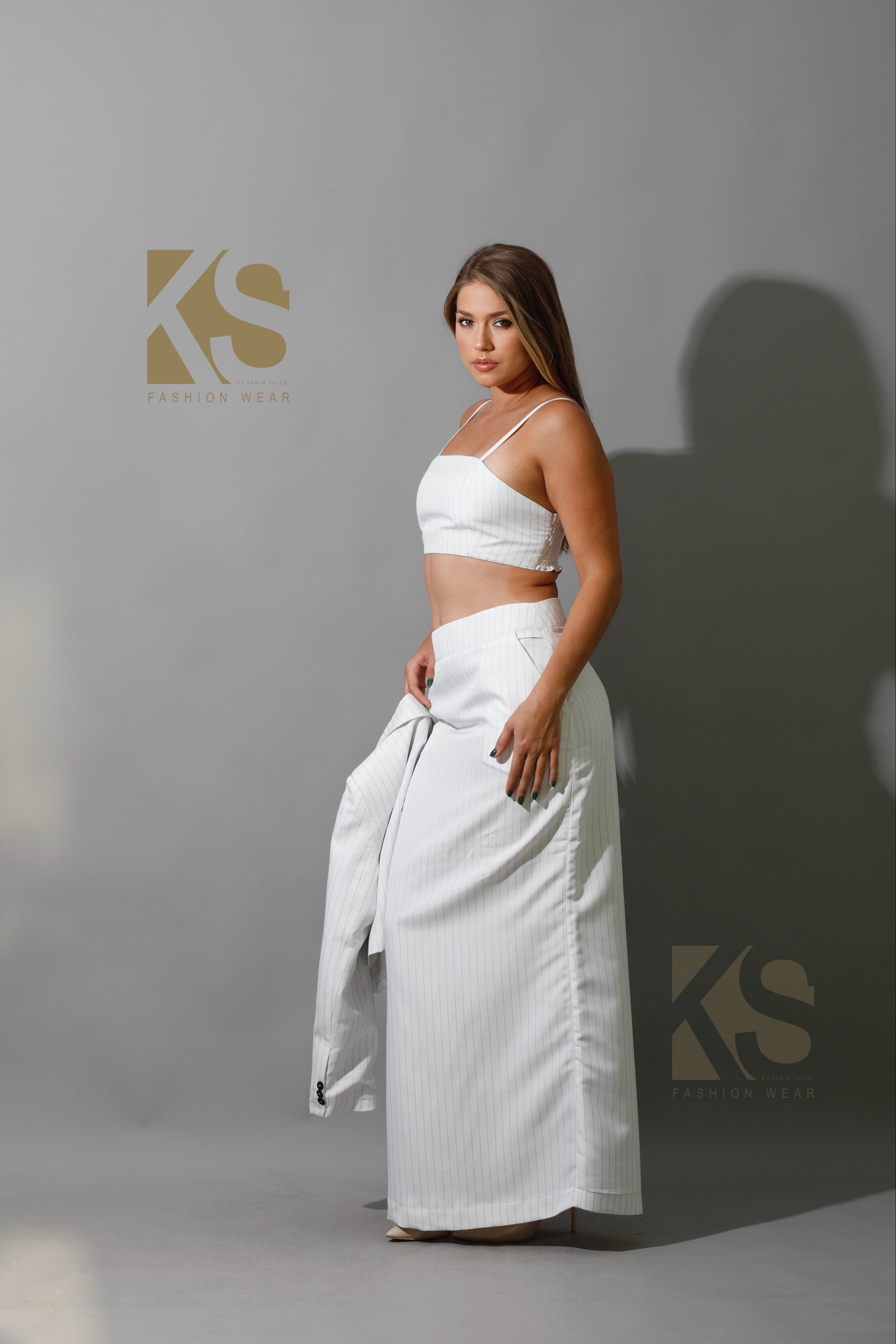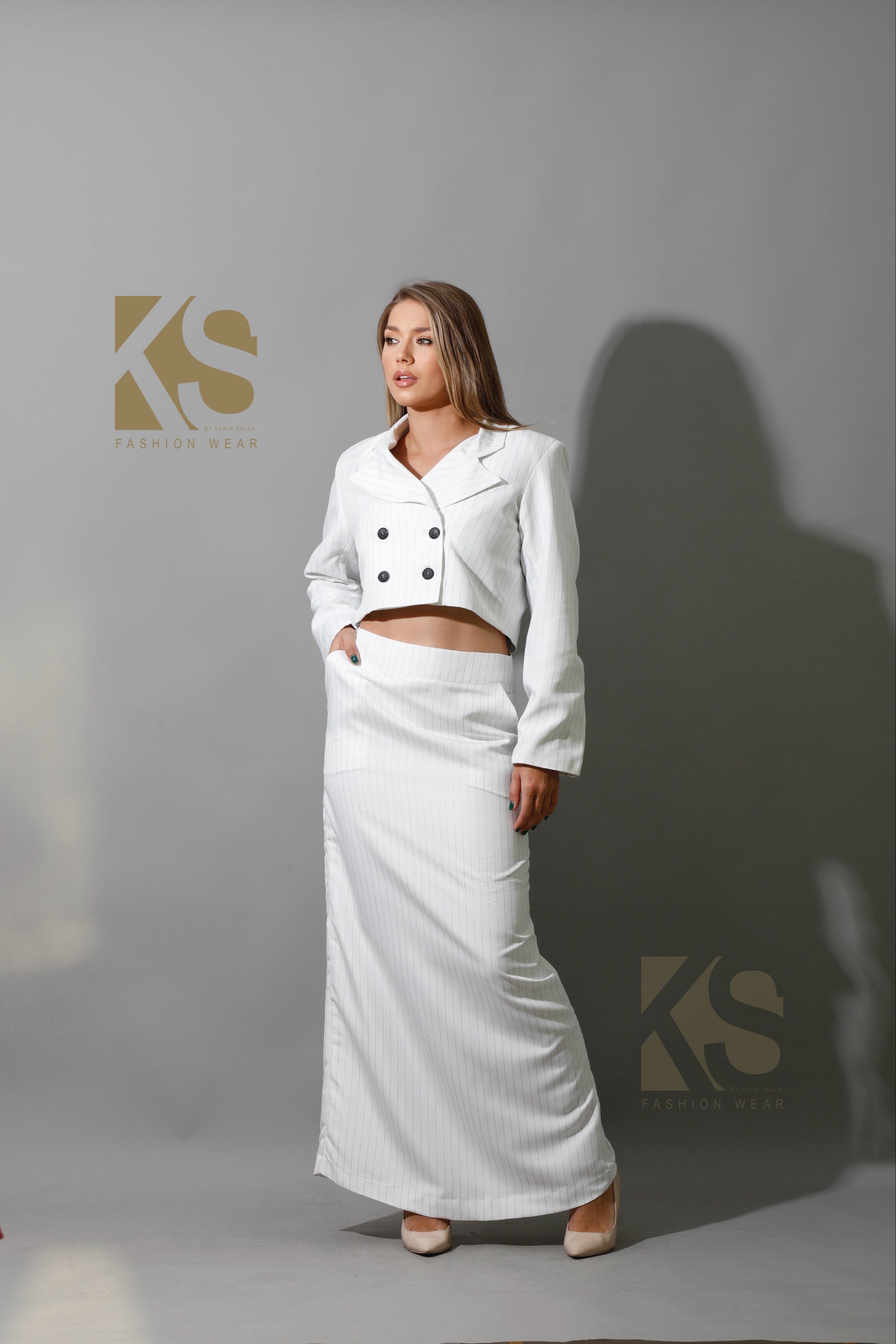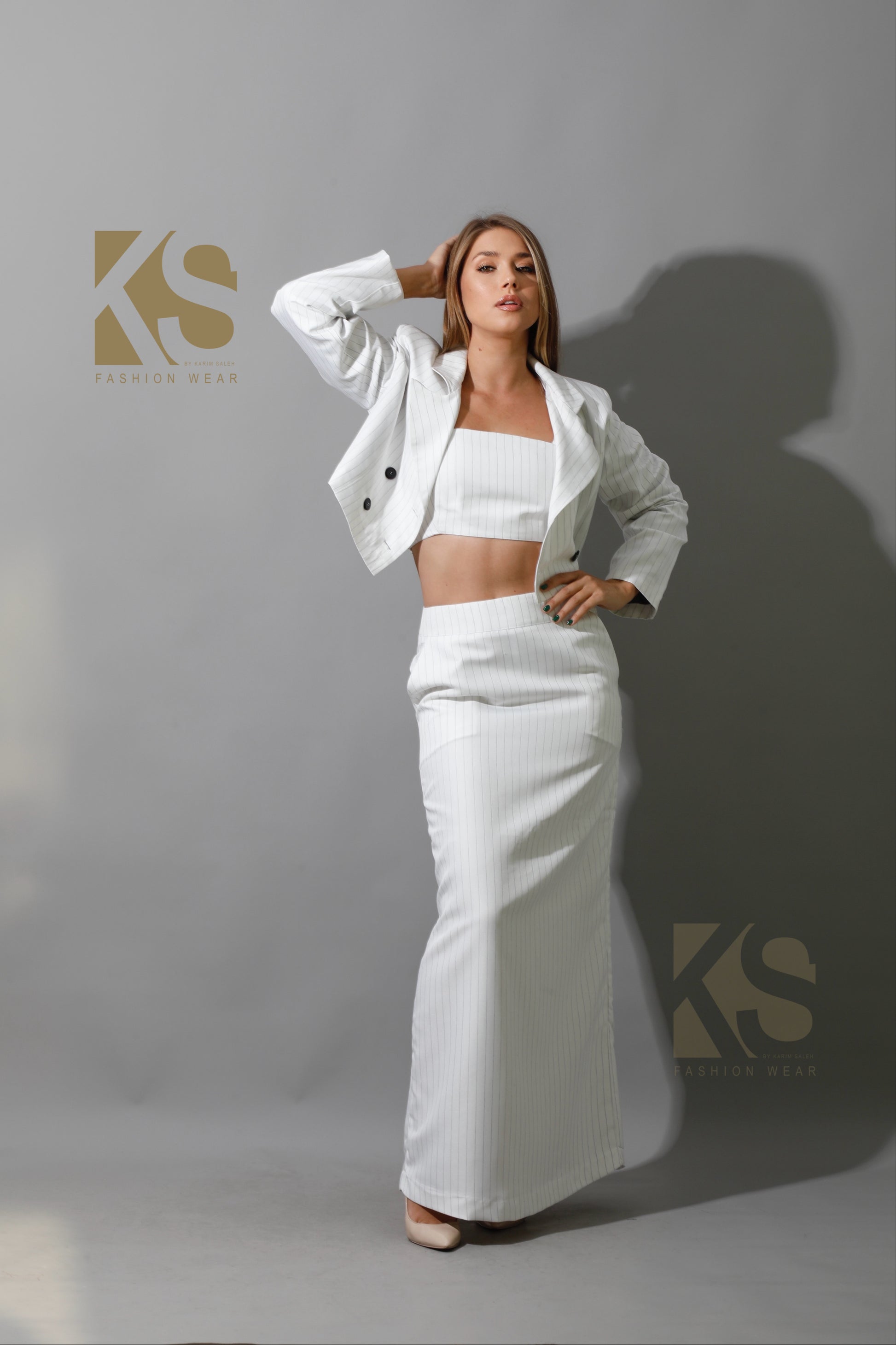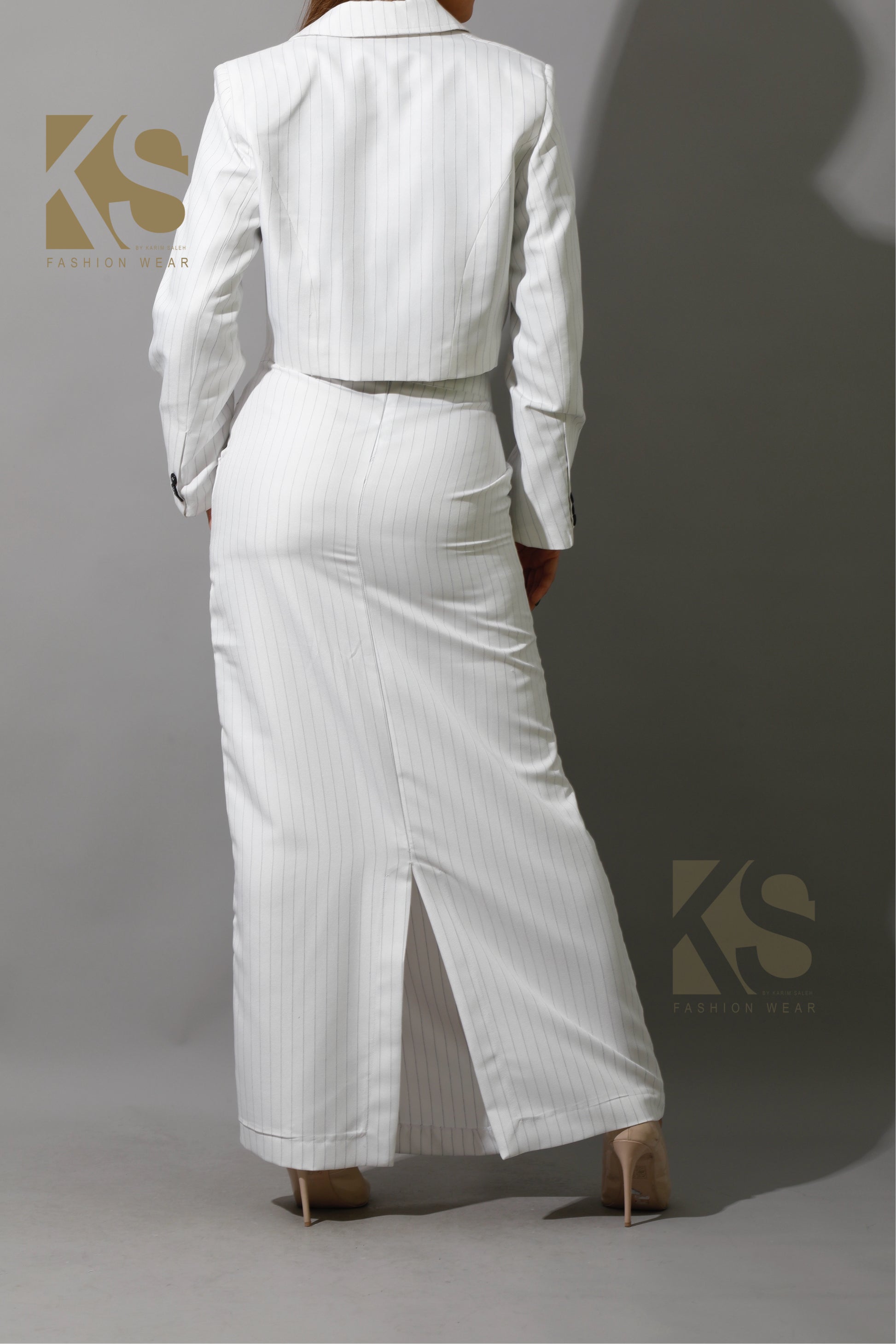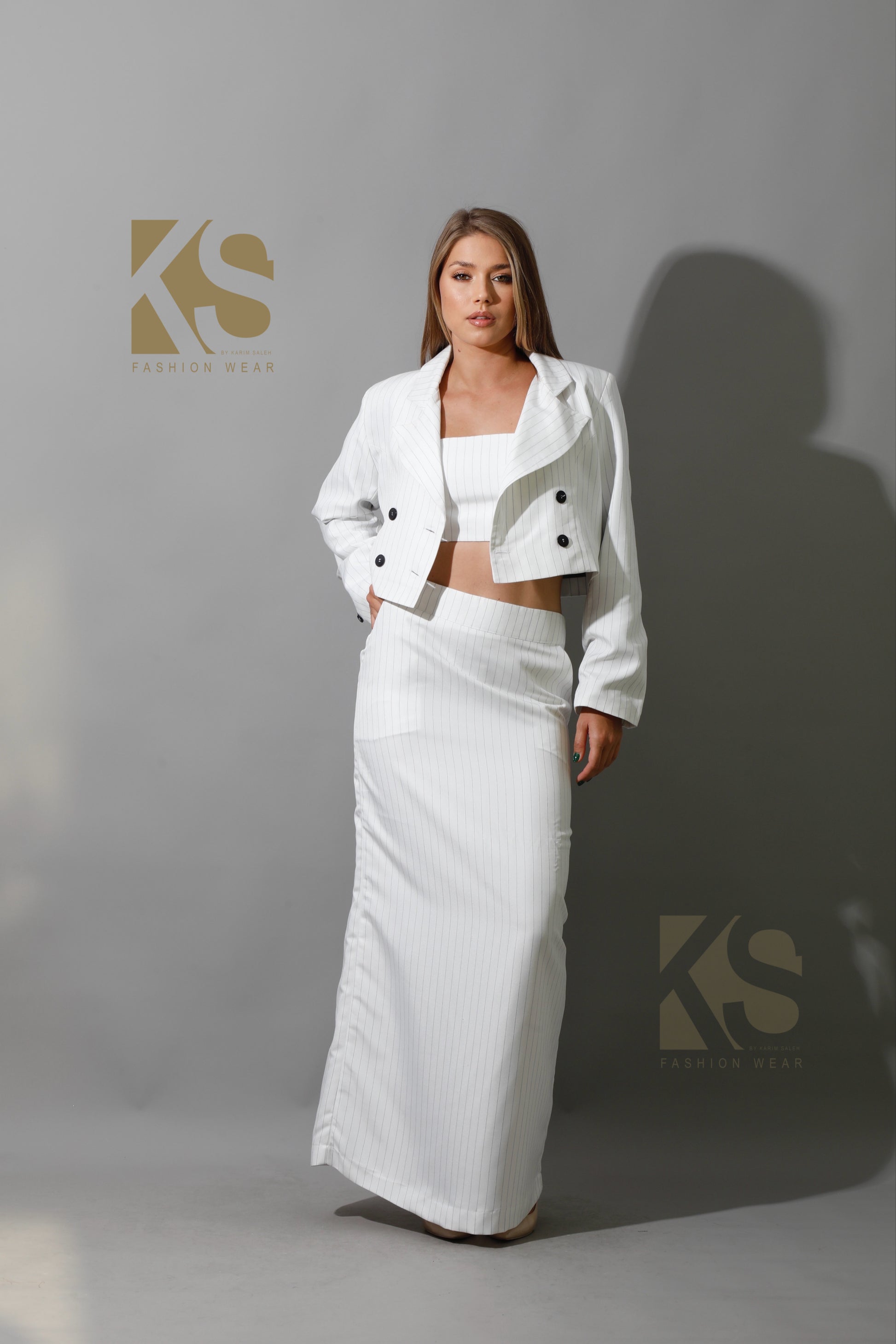 Striped Cropped Blazer, Bra Top & Maxi Skirt Co-Ord - White