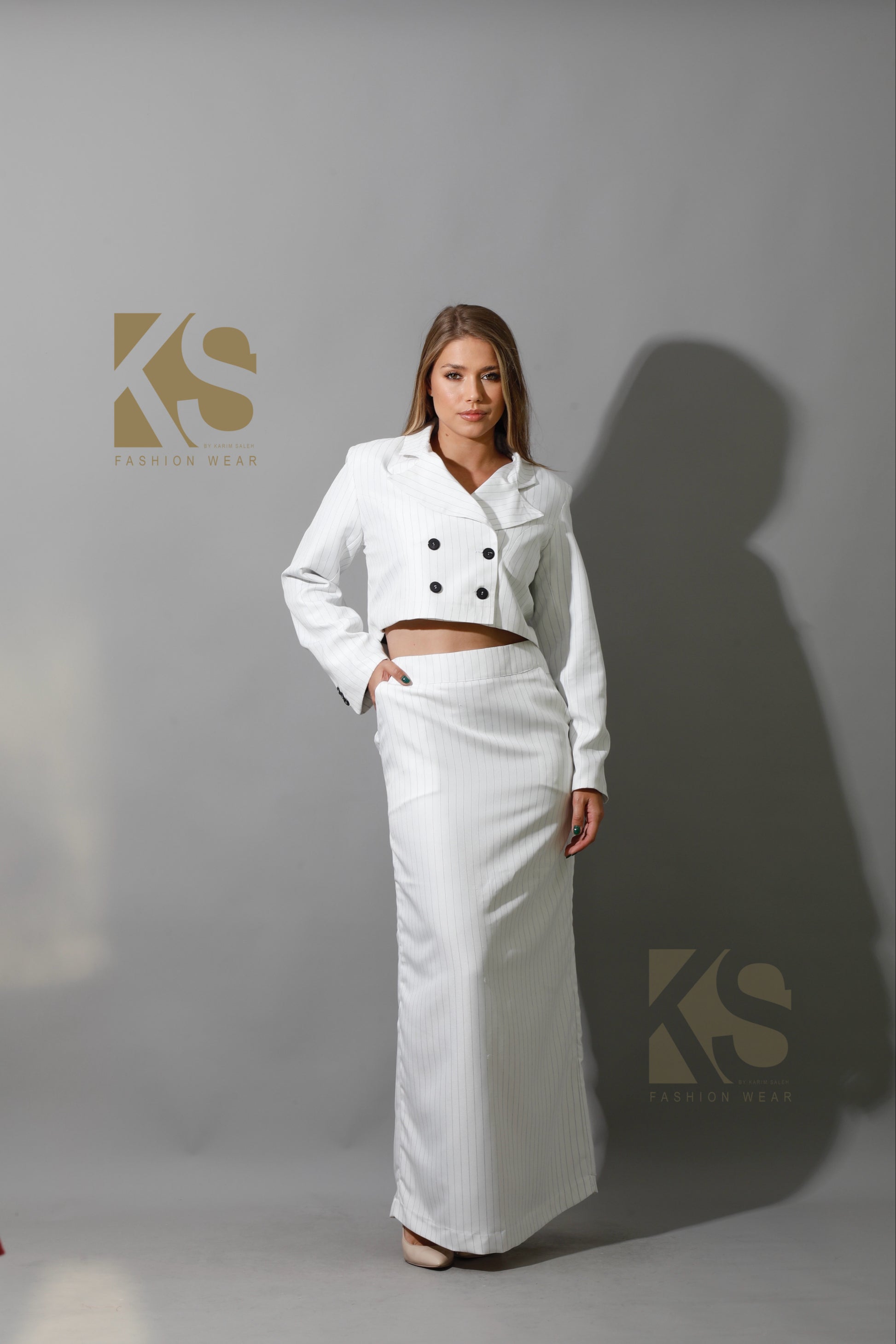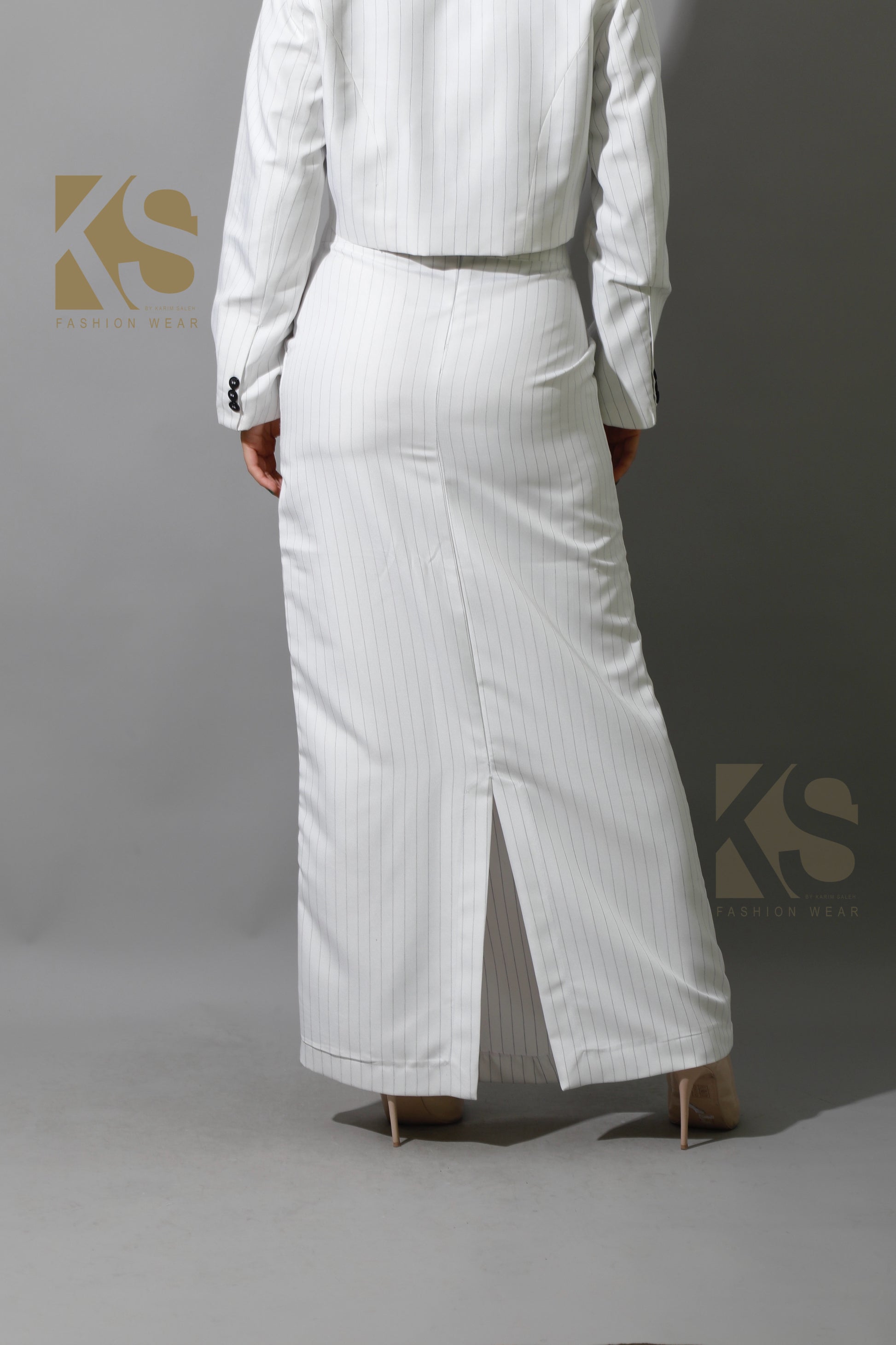 Woolen Striped Cropped Blazer, Bra Top & Maxi Skirt Co-Ord - White